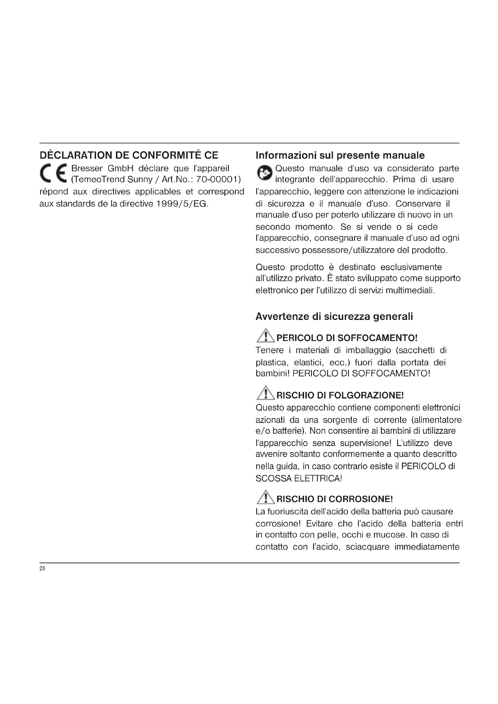 Bresser GmbH déclare que l’appareil (TemeoTrend Sunny / Art.No.: 70-00001) répond aux directives applicables et correspond aux standards de la directive 1999/5/EG. Informazioni sul presente manuale Questo manuale d’uso va considerato parte integrante dell’apparecchio. Prima di usare l’apparecchio, leggere con attenzione le indicazioni di sicurezza e il manuale d’uso. Conservare il manuale d’uso per poterlo utilizzare di nuovo in un secondo momento. Se si vende o si cede l’apparecchio, consegnare il manuale d’uso ad ogni successivo possessore/utilizzatore del prodotto. Questo prodotto è destinato esclusivamente all’utilizzo privato. È stato sviluppato come supporto elettronico per l’utilizzo di servizi multimediali. Avvertenze di sicurezza generali PERICOLO DI SOFFOCAMENTO! Tenere i materiali di imballaggio (sacchetti di plastica, elastici, ecc.) fuori dalla portata dei bambini! PERICOLO DI SOFFOCAMENTO! RISCHIO DI FOLGORAZIONE! Questo apparecchio contiene componenti elettronici azionati da una sorgente di corrente (alimentatore e/o batterie). Non consentire ai bambini di utilizzare l‘apparecchio senza supervisione! L’utilizzo deve avvenire soltanto conformemente a quanto descritto nella guida, in caso contrario esiste il PERICOLO di SCOSSA ELETTRICA! RISCHIO DI CORROSIONE! La fuoriuscita dell’acido della batteria può causare corrosione! Evitare che l’acido della batteria entri in contatto con pelle, occhi e mucose. In caso di contatto con l’acido, sciacquare immediatamente27 le parti interessate con abbondante acqua pulita e rivolgersi ad un medico. PERICOLO DI INCENDIO/ESPLOSIONE! Utilizzare esclusivamente le batterie consigliate. Non cortocircuitare o buttare nel fuoco l‘apparecchio e le batterie! Un surriscaldamento oppure un utilizzo non conforme può provocare cortocircuiti, incendi e persino esplosioni! NOTA! Non smontare l’apparecchio! In caso di guasto, rivolgersi al proprio rivenditore specializzato. Egli provvederà a contattare il centro di assistenza e se necessario a spedire l’apparecchio in riparazione. Mai immergere l’apparecchio in acqua. Non esporre l‘apparecchio a urti e vibrazioni violente, polvere, temperature elevate per lunghi periodi o umidità estrema. Si possono causare malfunzionamenti, cortocircuiti, danni alle batterie e ai componenti. Utilizzare esclusivamente le batterie consigliate. Sostituire le batterie scariche o usate sempre con una serie di batterie nuove completamente cariche. Non utilizzare batterie di marche, tipi o livelli di carica diversi. Togliere le batterie dall’apparecchio nel caso non venga utilizzato per un periodo prolungato! Il produttore declina ogni responsabilità per i danni causati dalla tensione a seguito dell’inserimento erroneo delle batterie. DOTAZIONE (Fig. 1) Stazione base (A), piedistallo per la stazione base (B), sensore esterno (C), istruzioni per l‘uso Batterie richieste (non in dotazione): 5 microbatterie (1,5V, tipo AAA)
