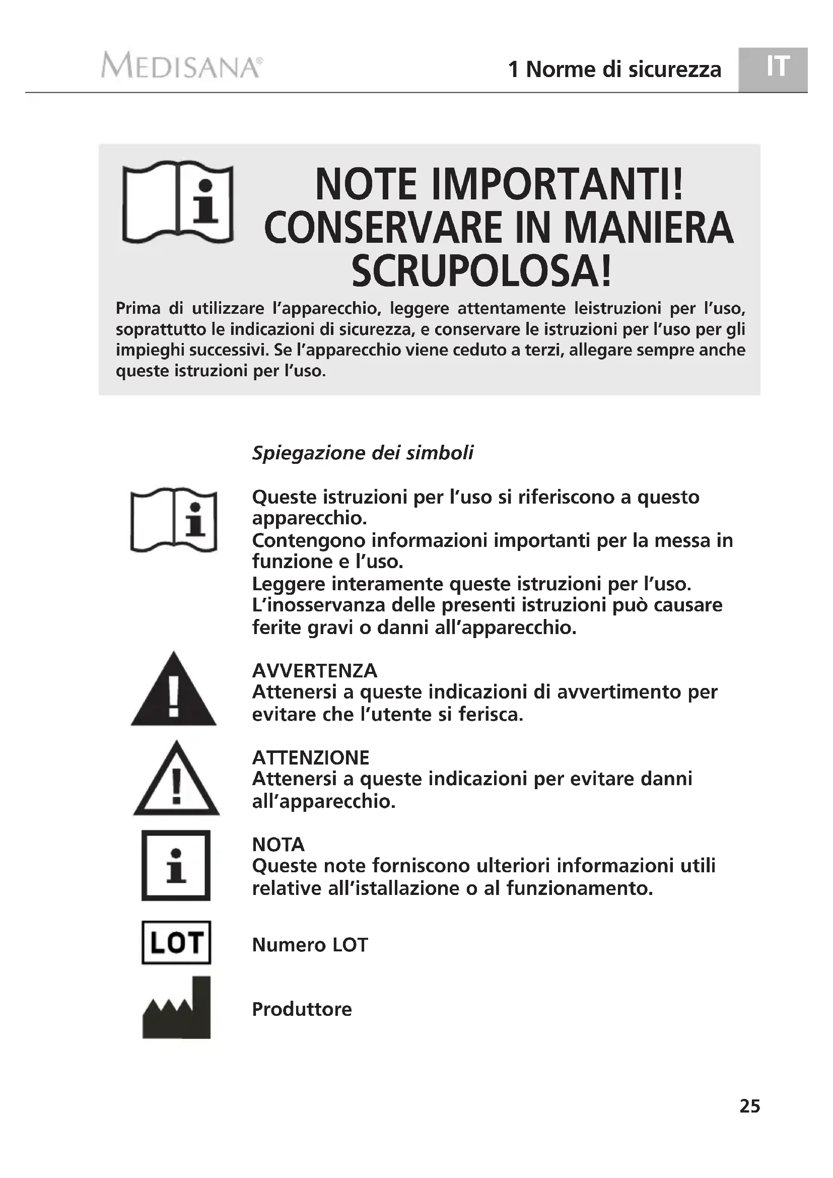 Per ottener il successo desiderato e poter utilizzare a lungo il vostro MEDISANA FRI, consigliamo di leggere attendamente leindicazioni segunti relative all'uso e alla piccola manutenzione.