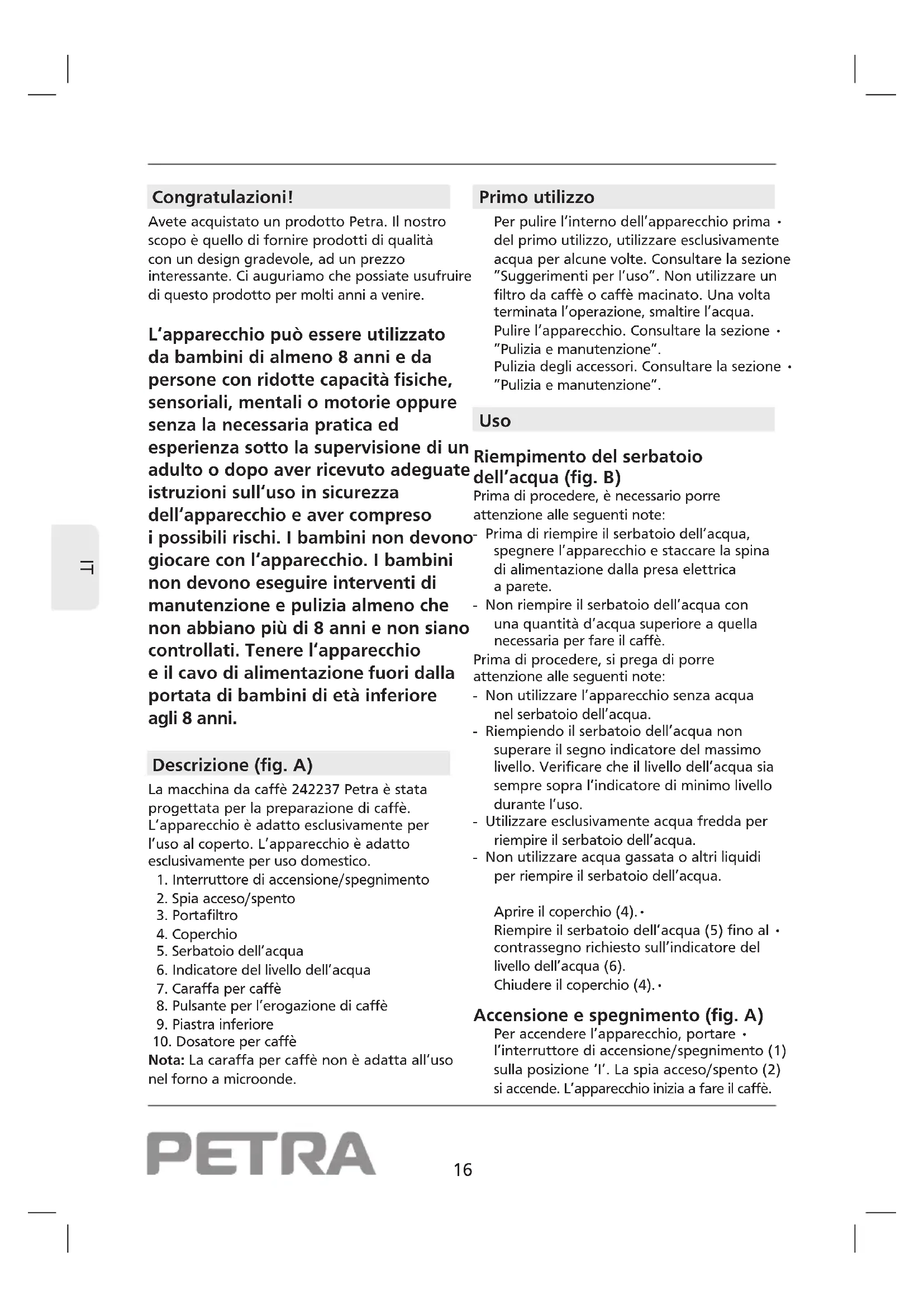 Congratulazioni! Avete acquistato un prodotto Petra. Il nostro scopo è quello di fornire prodotti di qualità con un design gradevole, ad un prezzo interessante. Ci auguriamo che possiate usufruire di questo prodotto per molti anni a venire. L‘apparecchio può essere utilizzato da bambini di almeno 8 anni e da persone con ridotte capacità fisiche, sensoriali, mentali o motorie oppure senza la necessaria pratica ed esperienza sotto la supervisione di un adulto o dopo aver ricevuto adeguate istruzioni sull‘uso in sicurezza dell‘apparecchio e aver compreso i possibili rischi. I bambini non devono giocare con l‘apparecchio. I bambini non devono eseguire interventi di manutenzione e pulizia almeno che non abbiano più di 8 anni e non siano controllati. Tenere l‘apparecchio e il cavo di alimentazione fuori dalla portata di bambini di età inferiore agli 8 anni. Descrizione (fig. A) La macchina da caffè 242237 Petra è stata progettata per la preparazione di caffè. L’apparecchio è adatto esclusivamente per l’uso al coperto. L’apparecchio è adatto esclusivamente per uso domestico.