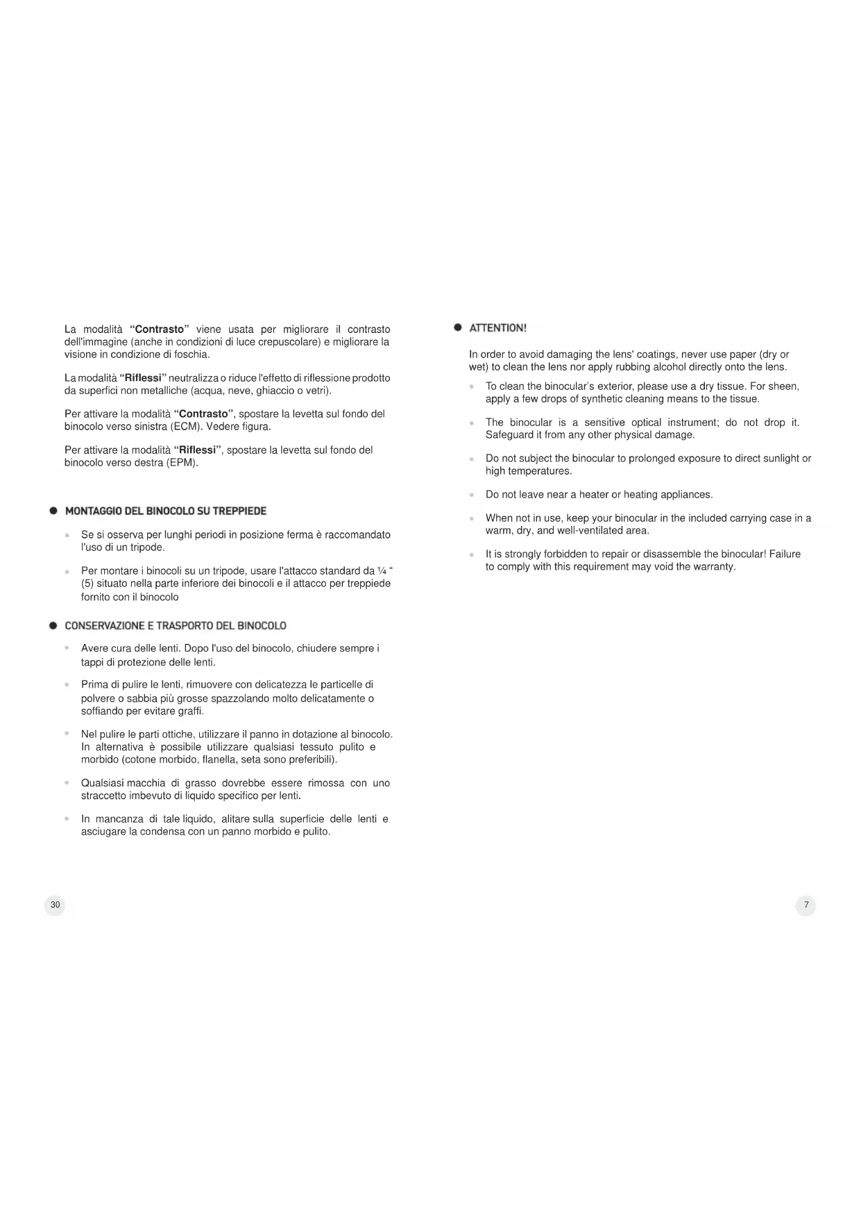 E' assolutamente vietato riparare o smontare il binocolo! L'inosservanza di esta regola invalida la garanzia.