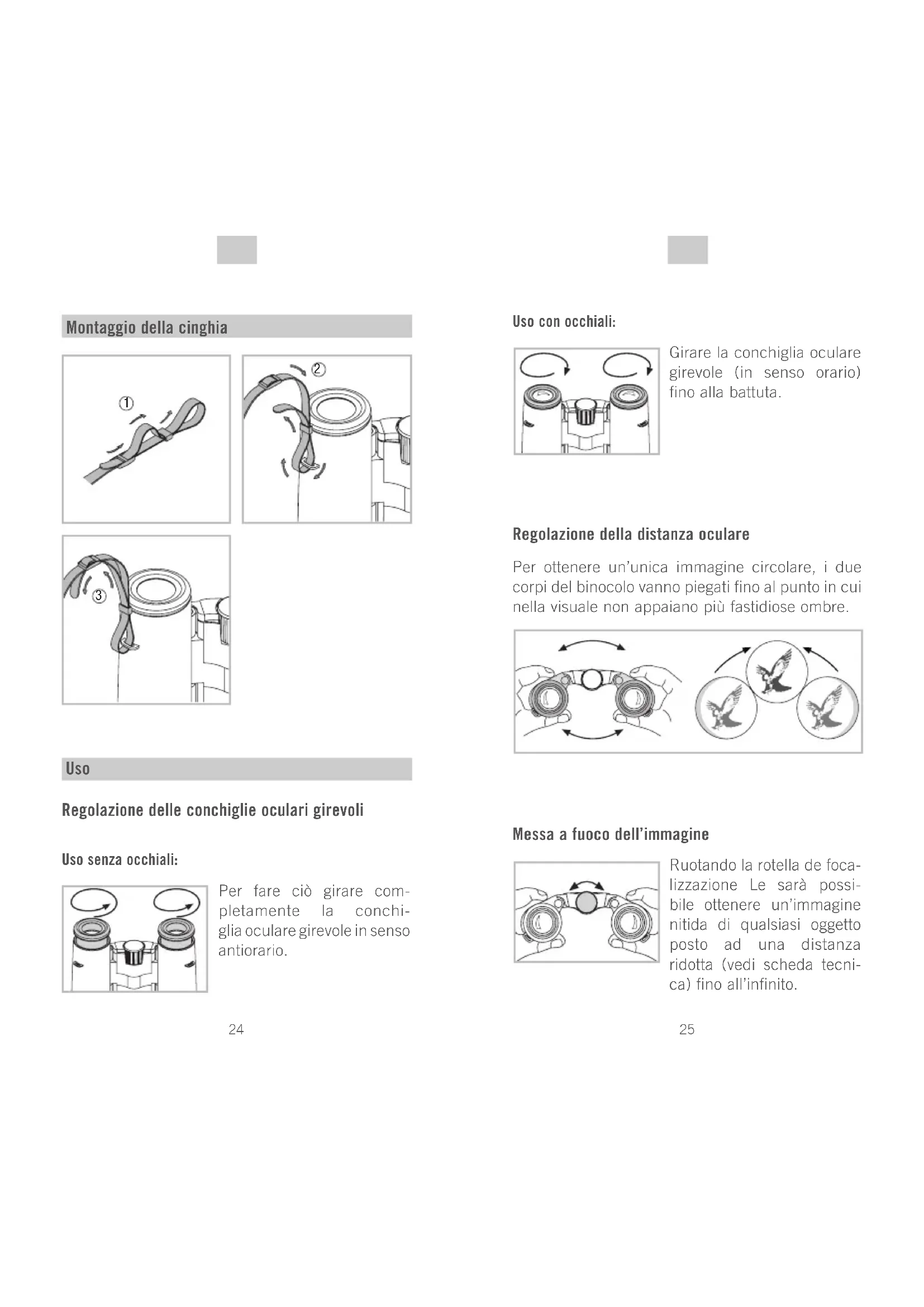 DE ITIT Manutenzione e cura Panno detergente Con l’ausilio dello speciale panno in microfibra potete effettuare Voi stessi la pulizia delle super- fici in vetro più delicate. Il panno è adatto alla pulizia di obiettivi, oculari e occhiali. Vi preghiamo di tenerlo pulito dato che lo sporco può danneggi- are la superficie delle lenti. Nel caso il panno si sporchi, potete lavarlo in acqua saponata tiepida e lasciarlo asciugare all’aria. Usatelo esclusivamente per la pulizia delle superfici in vetro! Pulizia Tutti i componenti e le superfici sono state realiz- zate in modo da poter essere pulite facilmente. Per poter preservare nel tempo la brillantezza ottica del Vostro binocolo, Vi consigliamo di evitare che le superfici in vetro entrino in contatto con sporco, olio e grasso. Quando effettuate la pulizia dello strumento allontanate dapprima le particelle più grosse con un pennello per l’ottica. Per la succes- siva pulizia a fondo è bene inumidire leggermente le parti con il fiato e pulirle quindi con il panno. Per la pulizia del corpo del binocolo l’ideale è servirsi di un panno morbido e umido (non con il panno per le lenti). Compensazione delle diottrie Per raggiungere una qualità d’immagine ideale bisogna compensare l’eventuale diversa capacità visiva fra l’occhio sinistro e quello destro. Uso con uguale capacità visiva di entrambi gli occhi: La compensazione diottrica è impostata su «zero». Uso con differente capacità visiva di entrambi gli occhi: