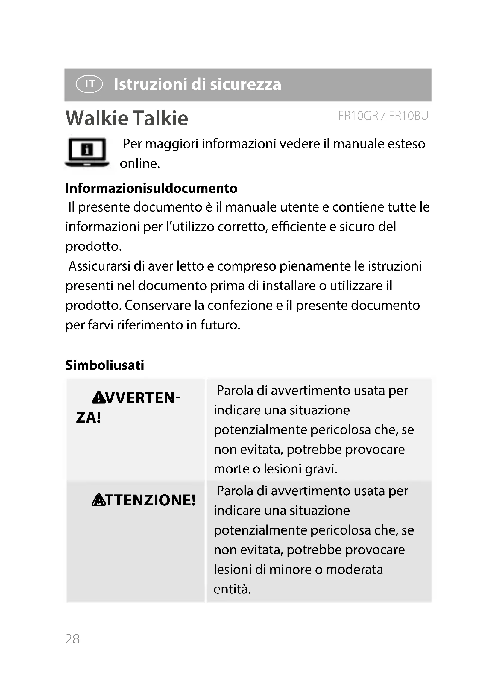 Istruzioni di sicurezza Walkie Talkie FR10GR / FR10BU Per maggiori informazioni vedere il manuale esteso online. Informazioni sul documento Il presente documento è il manuale utente e contiene tutte le informazioni per l’utilizzo corretto, eciente e sicuro del prodotto. Assicurarsi di aver letto e compreso pienamente le istruzioni presenti nel documento prima di installare o utilizzare il prodotto. Conservare la confezione e il presente documento per farvi riferimento in futuro. Simboli usati AVVERTEN- ZA! Parola di avvertimento usata per indicare una situazione potenzialmente pericolosa che, se non evitata, potrebbe provocare morte o lesioni gravi. ATTENZIONE! Parola di avvertimento usata per indicare una situazione potenzialmente pericolosa che, se non evitata, potrebbe provocare lesioni di minore o moderata entità.29Alecto | Safety instructions AVVISO Parola di avvertimento usata per riferirsi a pratiche non collegate a lesioni siche. Speciche Speciche Valore Ingresso di alimentazione 5 V DC / 2000 mA (adattatore USB non incluso) Tipo batteria 3 × 1.2 V 800 mAh Uso previsto Questo prodotto è destinato a un dispositivo di comunicazione wireless che consente agli utenti di comunicare su distanze no a 6 km in condizioni di campo aperto. Questo prodotto è inteso per utilizzo in interni e in esterni. Eventuali modiche al prodotto possono comportare conseguenze per la sicurezza, la garanzia e il corretto funzionamento. Il prodotto non è inteso per utilizzi professionali. Istruzioni di sicurezza Assicurarsi di aver letto e compreso pienamente le istruzioni presenti nel documento prima di installare o utilizzare il prodotto. Conservare la confezione e il presente documento per farvi riferimento in futuro.30