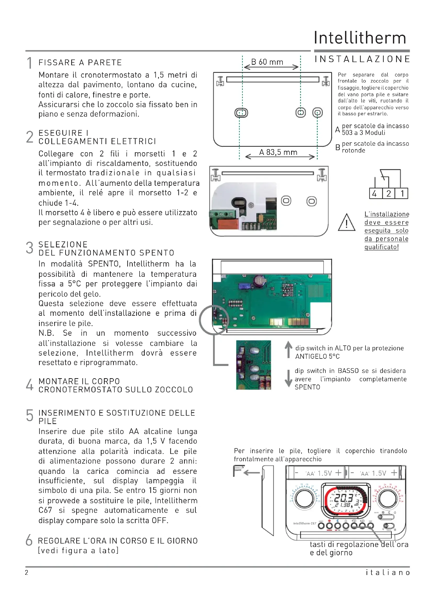 PILE Inserire due pile stilo AA alcaline lunga durata, di buona marca, da 1,5 V facendo attenzione alla polarità indicata. Le pile di alimentazione possono durare 2 anni: quando la carica comincia ad essere insufficiente, sul display lampeggia il simbolo di una pila. Se entro 15 giorni non si provvede a sostituire le pile, Intellitherm C67 si spegne automaticamente e sul display compare solo la scritta OFF.Per separare dal corpo frontale lo zoccolo per il fissaggio, togliere il coperchio del vano porta pile e svitare dall’alto le viti, ruotando il corpo dell’apparecchio verso il basso per estrarlo. ESEGUIRE I COLLEGAMENTI ELETTRICICollegare con 2 fili i morsetti 1 e 2 all’impianto di riscaldamento, sostituendo il termostato tradizionale in qualsiasi momento. All’aumento della temperatura ambiente, il relé apre il morsetto 1-2 e chiude 1-4. Il morsetto 4 è libero e può essere utilizzato per segnalazione o per altri usi. SELEZIONE DEL FUNZIONAMENTO SPENTOIn modalità SPENTO, Intellitherm ha la possibilità di mantenere la temperatura fissa a 5°C per proteggere l’impianto dai pericolo del gelo.Questa selezione deve essere effettuata al momento dell’installazione e prima di inserire le pile.N.B. Se in un momento successivo all’installazione si volesse cambiare la selezione, Intellitherm dovrà essere resettato e riprogrammato.dip switch in ALTO per la protezione ANTIGELO 5°Cdip switch in BASSO se si desidera avere l’impianto completamente SPENTO FISSARE A PARETEL’installazione deve essere eseguita solo da personale qualificato!Montare il cronotermostato a 1,5 metri di altezza dal pavimento, lontano da cucine, fonti di calore, finestre e porte. Assicurarsi che lo zoccolo sia fissato ben in piano e senza deformazioni. per scatole da incasso 503 a 3 Moduliper scatole da incasso rotonde