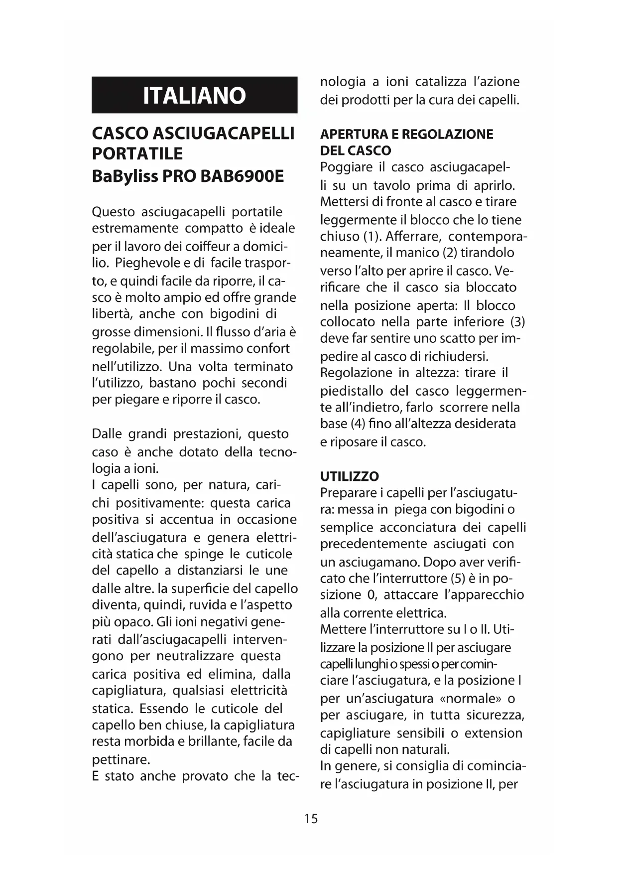 - Gebruik de terugname- en opha- lingssystemen die u ter beschik- king staan. Sommige materialen kunnen aldus worden gerecycleerd of worden benut.15 ITALIANO CASCO ASCIUGACAPELLI PORTATILE BaByliss PRO BAB6900E Questo asciugacapelli portatile estremamente compatto è ideale per il lavoro dei coiffeur a domici- lio. Pieghevole e di facile traspor- to, e quindi facile da riporre, il ca- sco è molto ampio ed offre grande libertà, anche con bigodini di grosse dimensioni. Il flusso d’aria è regolabile, per il massimo confort nell’utilizzo. Una volta terminato l’utilizzo, bastano pochi secondi per piegare e riporre il casco. Dalle grandi prestazioni, questo caso è anche dotato della tecno- logia a ioni. I capelli sono, per natura, cari- chi positivamente: questa carica positiva si accentua in occasione dell’asciugatura e genera elettri- cità statica che spinge le cuticole del capello a distanziarsi le une dalle altre. la superficie del capello diventa, quindi, ruvida e l’aspetto più opaco. Gli ioni negativi gene- rati dall’asciugacapelli interven- gono per neutralizzare questa carica positiva ed elimina, dalla capigliatura, qualsiasi elettricità statica. Essendo le cuticole del capello ben chiuse, la capigliatura resta morbida e brillante, facile da pettinare. E stato anche provato che la tec- nologia a ioni catalizza l’azione dei prodotti per la cura dei capelli.