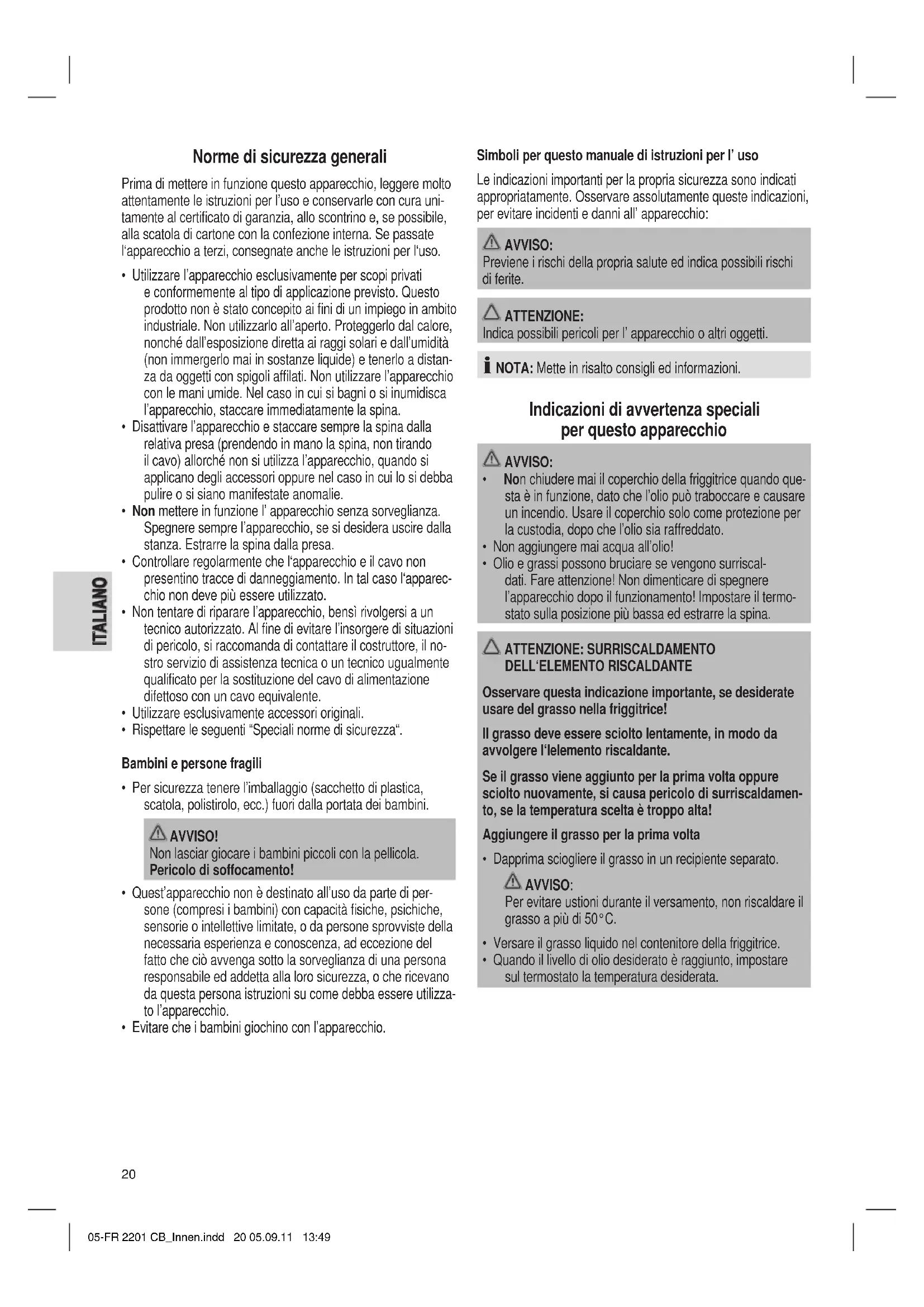 - Quando il livello di olio desiderato è raggiunto, impostare sul termostato la temperatura desiderata. 05-FR 2201 CB_Innen.indd 20 05.09.11 13:4921 ITALIANO Riscaldare nuovamente il grasso indurito nella friggitrice Se il grasso si è indurito nella friggitrice, non è più possibile costatare a che punto sia già sciolto sotto, vicino al riscla- damento