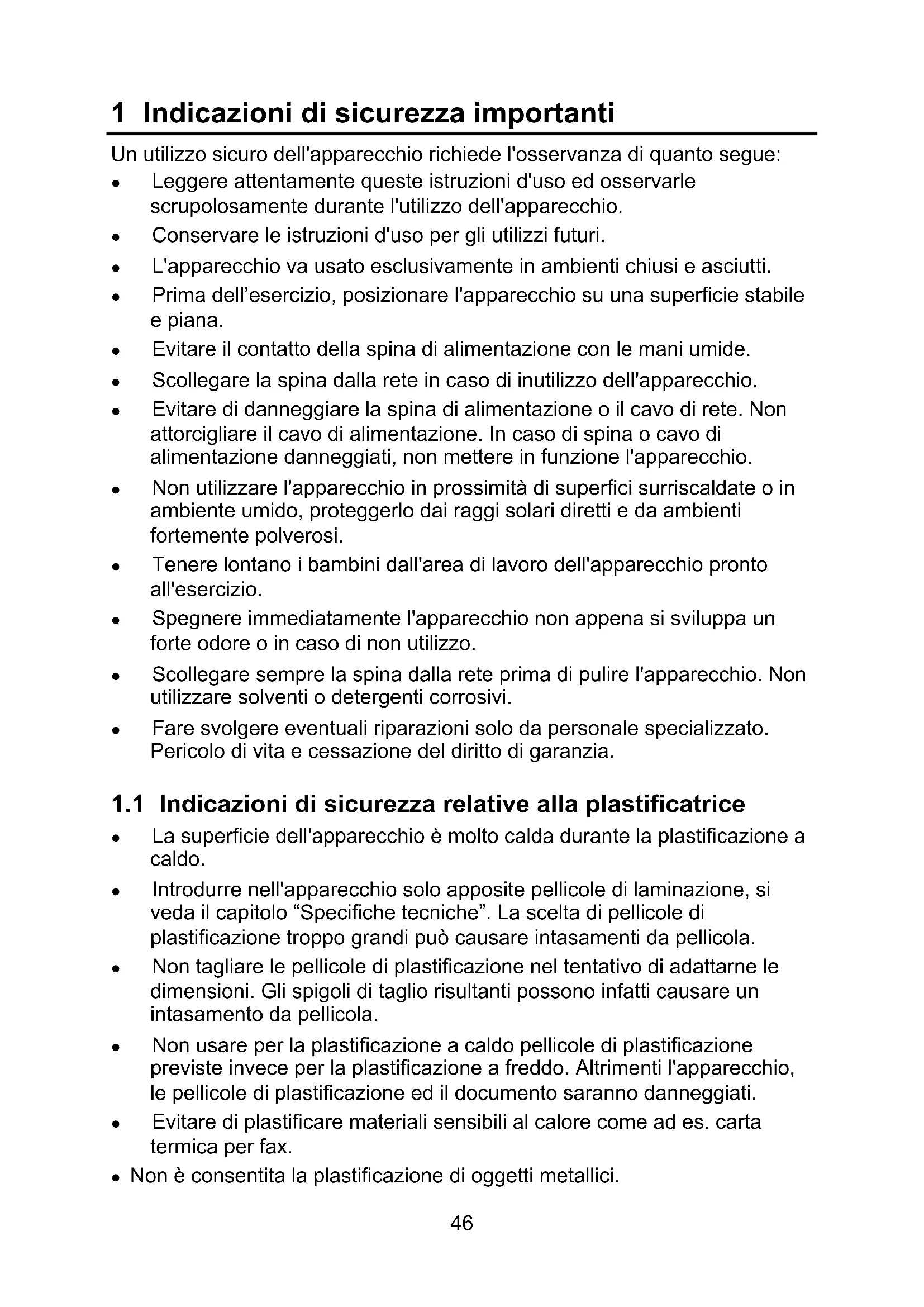 1.1 Indicazioni di sicurezza relative alla plastificatrice................... 46