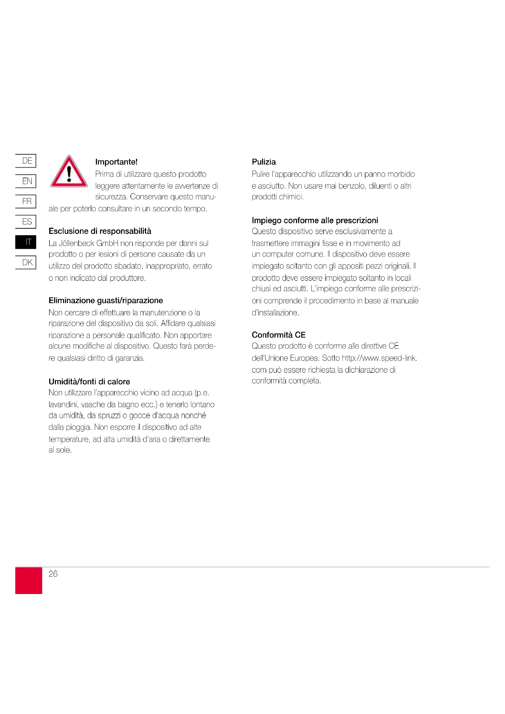 Importante! Prima di utilizzare questo prodotto leggere attentamente le avvertenze di sicurezza. Conservare questo manu- ale per poterlo consultare in un secondo tempo. Esclusione di responsabilità La Jöllenbeck GmbH non risponde per danni sul prodotto o per lesioni di persone causate da un utilizzo del prodotto sbadato, inappropriato, errato o non indicato dal produttore. Eliminazione guasti/riparazione Non cercare di effettuare la manutenzione o la riparazione del dispositivo da soli. Affidare qualsiasi riparazione a personale qualificato. Non apportare alcune modifiche al dispositivo. Questo farà perde- re qualsiasi diritto di garanzia. Umidità/fonti di calore Non utilizzare l’apparecchio vicino ad acqua (p.e. lavandini, vasche da bagno ecc.) e tenerlo lontano da umidità, da spruzzi o gocce d‘acqua nonché dalla pioggia. Non esporre il dispositivo ad alte temperature, ad alta umidità d‘aria o direttamente al sole. Pulizia Pulire l‘apparecchio utilizzando un panno morbido e asciutto. Non usare mai benzolo, diluenti o altri prodotti chimici. Impiego conforme alle prescrizioni Questo dispositivo serve esclusivamente a trasmettere immagini fisse e in movimento ad un computer comune. Il dispositivo deve essere impiegato soltanto con gli appositi pezzi originali. Il prodotto deve essere impiegato soltanto in locali chiusi ed asciutti. L’impiego conforme alle prescrizi- oni comprende il procedimento in base al manuale d’installazione. Conformità CE Questo prodotto è conforme alle direttive CE dell‘Unione Europea. Sotto http://www.speed-link. com può essere richiesta la dichiarazione di conformità completa.DE