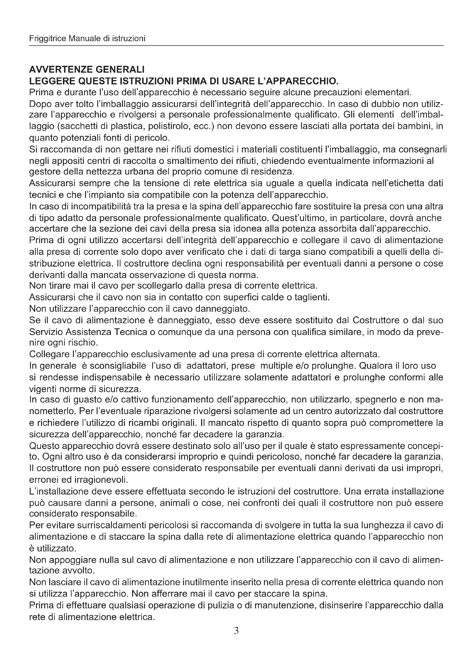Questo apparecchio è stato progettato per friggere cibi e per uso esclusivamente domestico, non delve essere utilizzato per altri scopi e non delve essere modificato o manomesso in alcun modo.