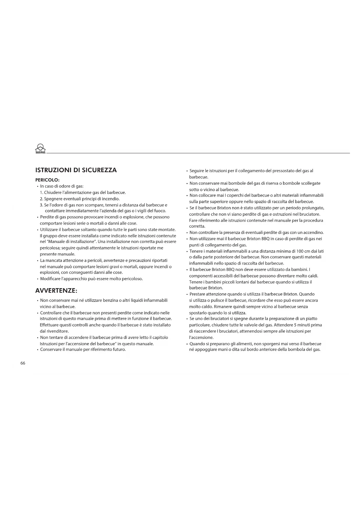 - Se il barbecue Brixton non è stato utilizzato per un periodo prolungato, controllare che non vi siano perdite di gas e ostruzioni nel bruciatore. Fare riferimento alle istruzioni contenute nel manuale per la procedura corretta.