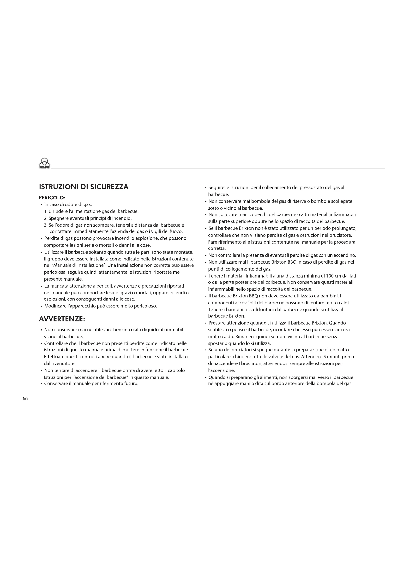 - Non utilizzare mai il barbecue Brixton BBQ in caso di perdite di gas nei punti di collegamento del gas.