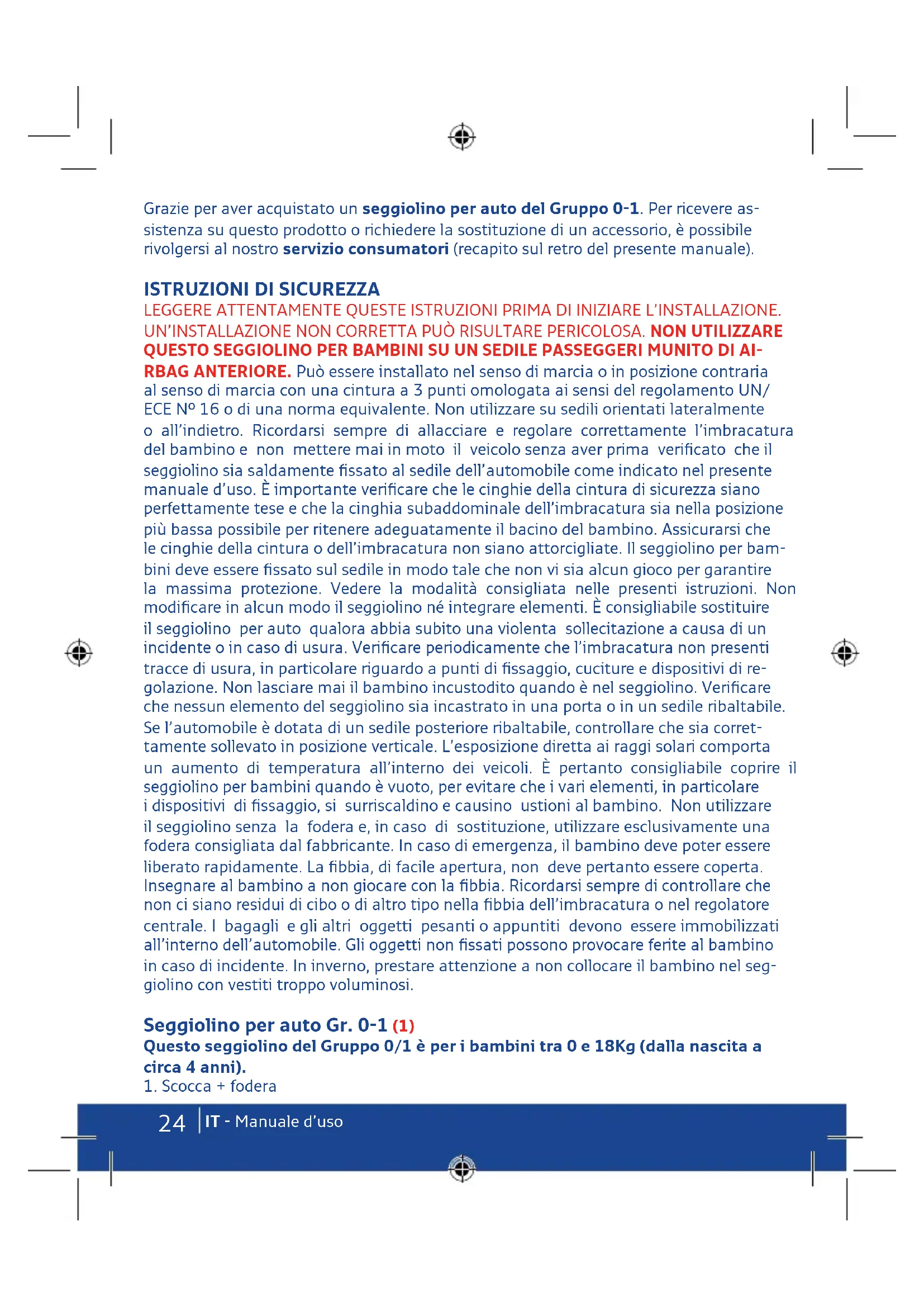 LEGGERE ATTENTAMENTE QUESTE ISTRUZIONI PRIMA DI INIZIARE L’INSTALLAZIONE. UN’INSTALLAZIONE NON CORRETTA PUÒ RISULTARE PERICOLOSA. NON UTILIZZARE QUESTO SEGGIOLINO PER BAMBINI SU UN SEDILE PASSEGGERI MUNITO DI AI- RBAG ANTERIORE. Può essere installato nel senso di marcia o in posizione contraria al senso di marcia con una cintura a 3 punti omologata ai sensi del regolamento UN/ ECE N° 16 o di una norma equivalente. Non utilizzare su sedili orientati lateralmente o all’indietro. Ricordarsi sempre di allacciare e regolare correttamente l’imbracatura del bambino e non mettere mai in moto il veicolo senza aver prima verificato che il seggiolino sia saldamente fissato al sedile dell’automobile come indicato nel presente manuale d’uso. È importante verificare che le cinghie della cintura di sicurezza siano perfettamente tese e che la cinghia subaddominale dell’imbracatura sia nella posizione più bassa possibile per ritenere adeguatamente il bacino del bambino. Assicurarsi che le cinghie della cintura o dell’imbracatura non siano attorcigliate. Il seggiolino per bam- bini deve essere fissato sul sedile in modo tale che non vi sia alcun gioco per garantire la massima protezione. Vedere la modalità consigliata nelle presenti istruzioni. Non modificare in alcun modo il seggiolino né integrare elementi. È consigliabile sostituire il seggiolino per auto qualora abbia subito una violenta sollecitazione a causa di un incidente o in caso di usura. Verificare periodicamente che l’imbracatura non presenti tracce di usura, in particolare riguardo a punti di fissaggio, cuciture e dispositivi di re- golazione. Non lasciare mai il bambino incustodito quando è nel seggiolino. Verificare che nessun elemento del seggiolino sia incastrato in una porta o in un sedile ribaltabile. Se l’automobile è dotata di un sedile posteriore ribaltabile, controllare che sia corret- tamente sollevato in posizione verticale. L’esposizione diretta ai raggi solari comporta un aumento di temperatura all’interno dei veicoli. È pertanto consigliabile coprire il seggiolino per bambini quando è vuoto, per evitare che i vari elementi, in particolare i dispositivi di fissaggio, si surriscaldino e causino ustioni al bambino. Non utilizzare il seggiolino senza la fodera e, in caso di sostituzione, utilizzare esclusivamente una fodera consigliata dal fabbricante. In caso di emergenza, il bambino deve poter essere liberato rapidamente. La fibbia, di facile apertura, non deve pertanto essere coperta. Insegnare al bambino a non giocare con la fibbia. Ricordarsi sempre di controllare che non ci siano residui di cibo o di altro tipo nella fibbia dell’imbracatura o nel regolatore centrale. I bagagli e gli altri oggetti pesanti o appuntiti devono essere immobilizzati all’interno dell’automobile. Gli oggetti non fissati possono provocare ferite al bambino in caso di incidente. In inverno, prestare attenzione a non collocare il bambino nel seg- giolino con vestiti troppo voluminosi. Seggiolino per auto Gr. 0-1 (1) Questo seggiolino del Gruppo 0/1 è per i bambini tra 0 e 18Kg (dalla nascita a circa 4 anni).