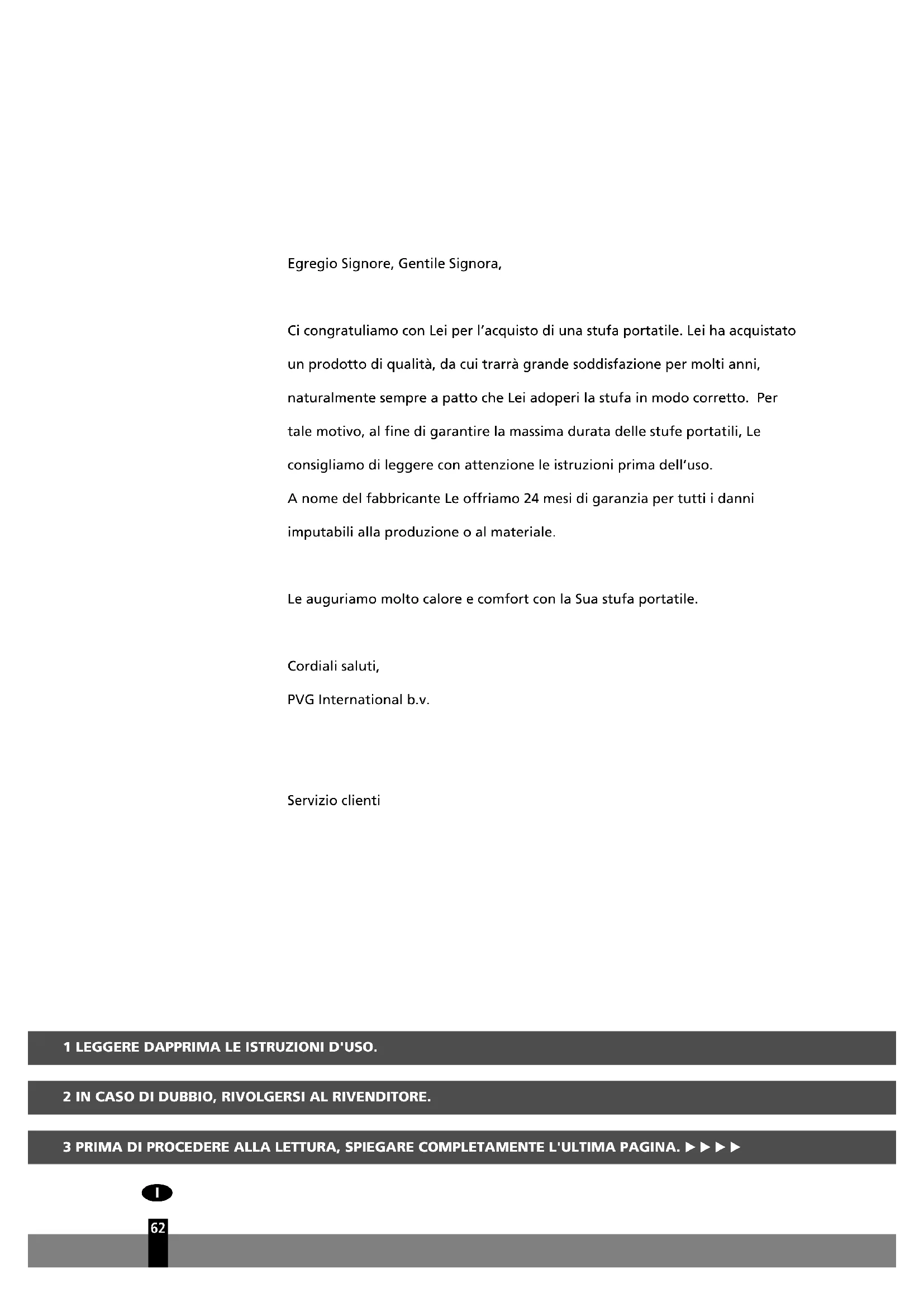 18a 18b 18dEgregio Signore, Gentile Signora, Ci congratuliamo con Lei per l’acquisto di una stufa portatile. Lei ha acquistato un prodotto di qualità, da cui trarrà grande soddisfazione per molti anni, naturalmente sempre a patto che Lei adoperi la stufa in modo corretto. Per tale motivo, al fine di garantire la massima durata delle stufe portatili, Le consigliamo di leggere con attenzione le istruzioni prima dell’uso. A nome del fabbricante Le offriamo 24 mesi di garanzia per tutti i danni imputabili alla produzione o al materiale. Le auguriamo molto calore e comfort con la Sua stufa portatile. Cordiali saluti, PVG International b.v. Servizio clienti 1 LEGGERE DAPPRIMA LE ISTRUZIONI D'USO. 2 IN CASO DI DUBBIO, RIVOLGERSI AL RIVENDITORE. 3 PRIMA DI PROCEDERE ALLA LETTURA, SPIEGARE COMPLETAMENTE L'ULTIMA PAGINA. E E E E