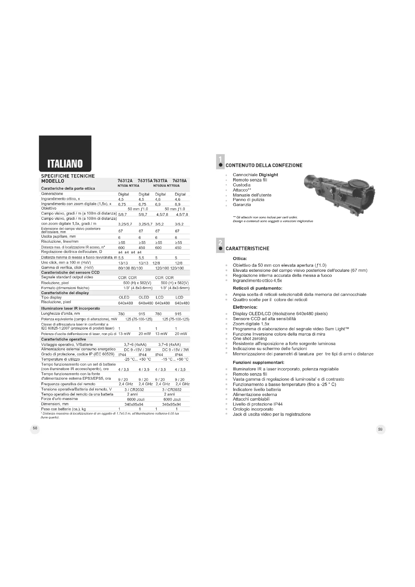 Si prega di notare che a causa della tecnologia OLED display (modelli 76312A e 76315A), dopo il caricamento di un nuovo reticolo, è possibile avere sul display del cannocchiale un "immagine fantasma" del reticolo precedente. L"immagine fantasma" si presenta con linee bianche semitrasparenti. L'immagine potrebbe apparire se il nuovo reticolo non contiene elementi (quall linee, cerchi, bar, ecc.) del reticolo precedente. Dopo un po' l' "immagine fantasma" diventa meno evidente. Non ci assumiamo alcuna responsabilità per reclami dovuti all' "immagine fantasma", per il continuo cambiamento dei reticoli.
