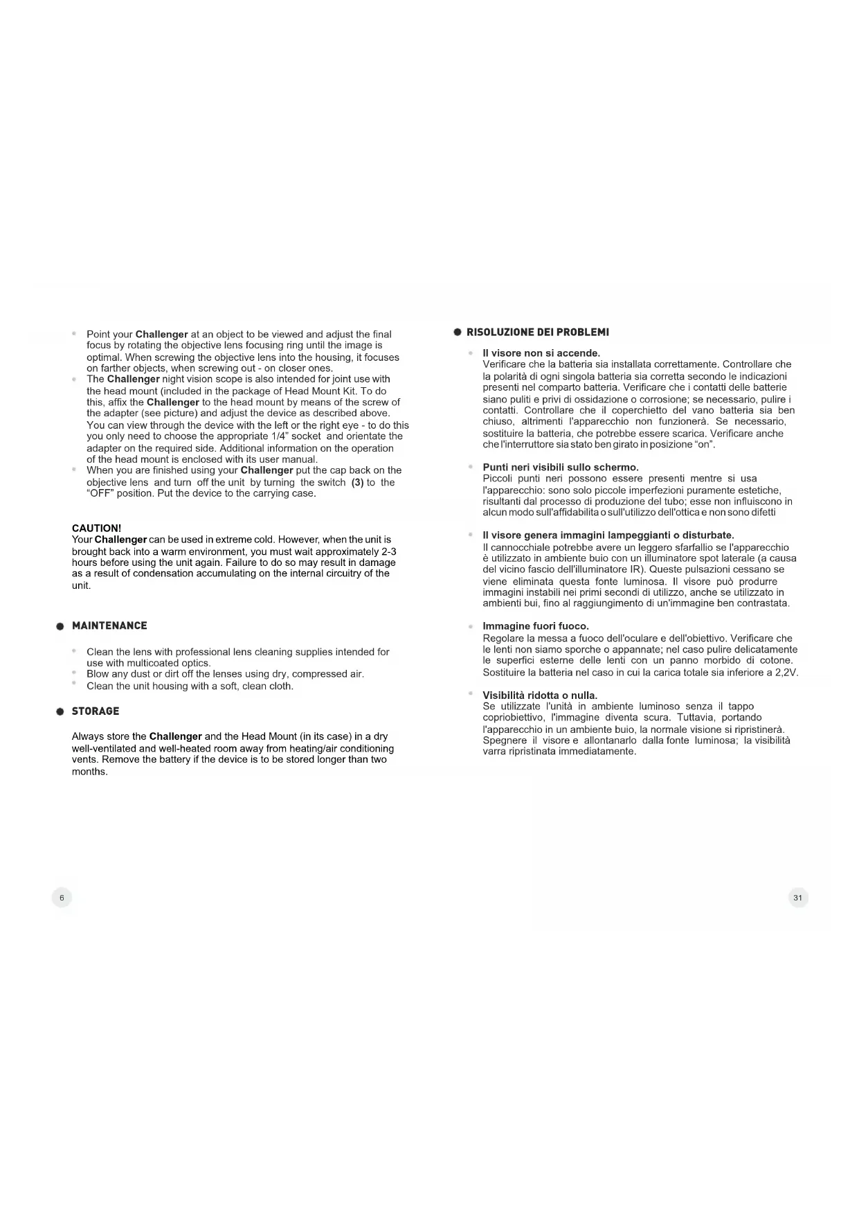 Il vostro Challenger è pronto all'uso: non aprire il corpo del monocolo o tentare di effettuare manutenzioni/riparazioni. In caso di necessità, rivolgetevi al rivenditore per la riparazione. - Proteggere l'apparecchio dall'esposizione diretta al sole, pioggia ed temperature estreme. Conservare unità in luogo caldo e asciutto e lontano da fonti di calore diretto.
