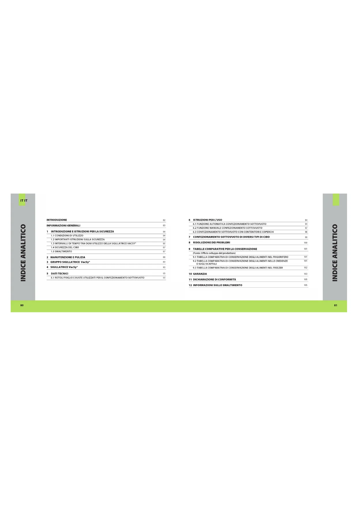 INDICE ANALITICO INDICE ANALITICO8382 IT IT Avete appena acquistato uno dei nuovi prodotti della ZEPTER INTERNATIONAL, tra i più efficienti ed economici, per la corretta conservazione degli alimenti. Quando scegliete un prodotto VacSy®, realizzato da una società all'insegna della qualità, dell'eleganza e dell'innovazione nella vita di tutti i giorni, regalate alla vostra famiglia gioia e benessere. La sigillatrice VacSy® è un apparecchio portatile, e allo stesso tempo potente, dal design esclusivo e intelligente che piace al primo sguardo. Scoprite quanto sia incredibilmente semplice utilizzare la sigillatrice VacSy® e quanto incredibili siano i benefici per chi la usa. La sigillatrice VacSy®, i contenitori e i coperchi universali sono indispensabili in ogni cucina. Sono stati ideati per la conservazione naturale del cibo e per conservare più a lungo il cibo cotto e crudo senza perdere la qualità degli alimenti. La sigillatrice VacSy® preserva le qualità organolettiche e il contenuto vitaminico degli alimenti. La conservazione in frigorifero, dispensa o in un imballaggio che preserva la freschezza del cibo non impedisce all'ossigeno di venire a contatto con l'alimento. Prima di utilizzare la sigillatrice VacSy® per la prima volta, leggete questo manuale d'uso e conservatelo per eventuali riferimenti futuri.