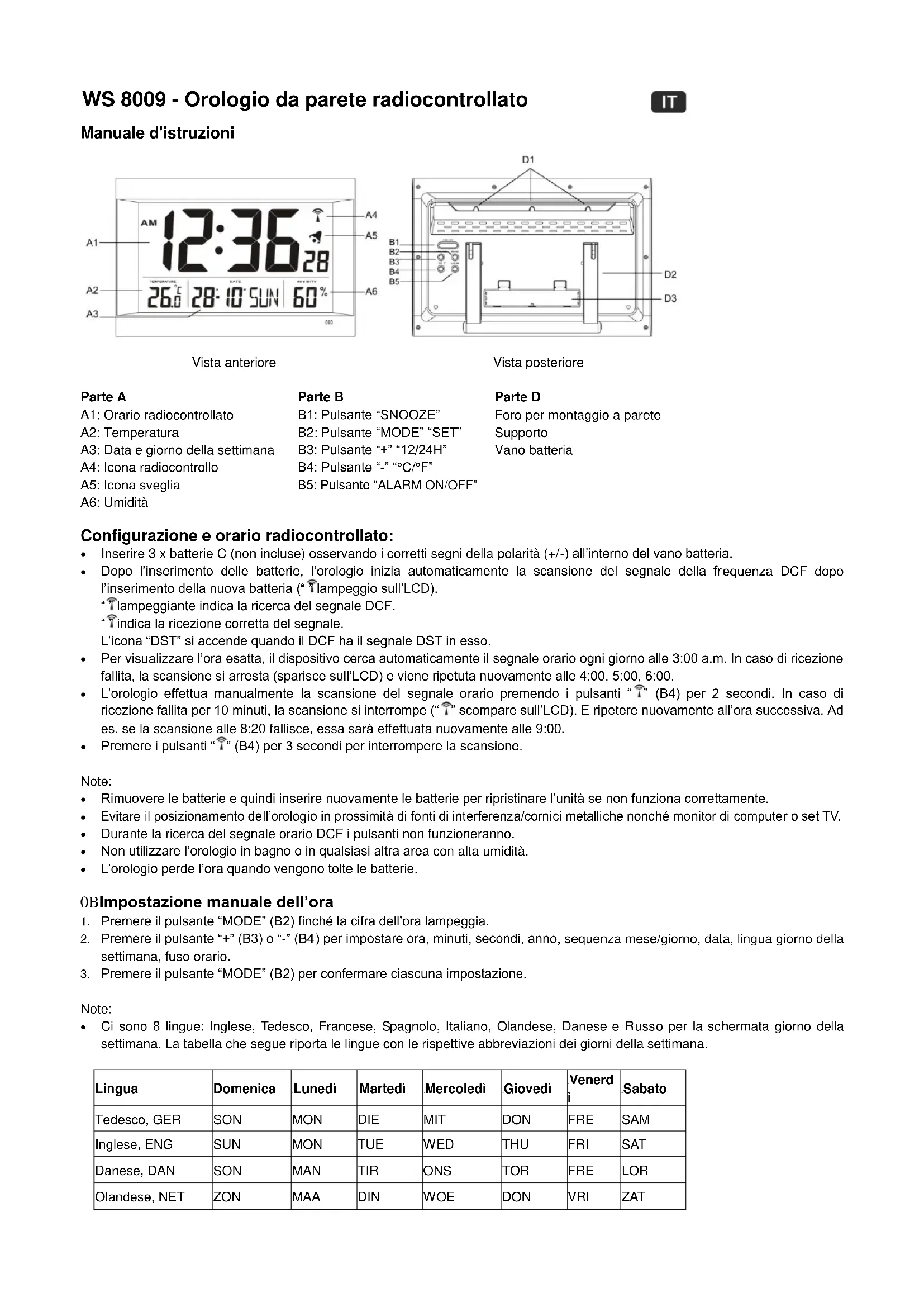 Termometro: Premere il pulsante “°C/°F” (B4) per selezionare la temperatura visualizzata in Celsius o Fahrenheit. Con la presente Technotrade dichiara che questo WS8009 è conforme ai requisiti essenziali ed alle altre disposizioni pertinenti stabilite dalla direttiva 2014/53/EU e ROHS 2011/65/CE. La dichiarazione di conformità UE originale si trova a: www.technoline.de/doc/4029665080093 Effetti ricezione ambientale L’orario ottiene l'orario preciso con tecnologia wireless. Come per tutti i dispositivo wireless, la ricezione può essere influenzata dalle seguenti circostanze: lunga distanza di trasmissione prossimità di montagne e valli in prossimità di autostrada, stazione, aeroporti, cavi di alta tensione ecc. in prossimità di cantieri tra edifici alti all'interno di edifici in cemento in prossimità di apparecchiature elettriche (computer, TV, ecc.) e di strutture metalliche all'interno di veicoli in movimento Porre l’orario in una posizione con segnale ottimale, ad es. vicino a una finestra e lontano da superfici in metallo o apparecchiature elettriche. Precauzioni Il dispositivo principale è progettata solo per l'utilizzo in ambienti interni. Non sottoporre il dispositivo a forza eccessiva e urti. Non esporre il dispositivo a temperature estreme, luce solare diretta, polvere o umidità. Non immergere il dispositivo in acqua. Evitare il contatto con materiali corrosivi. Non gettare il dispositivo nel fuoco perché potrebbe esplodere. Non aprire la cassa interna o manomettere i componenti di questa dispositivo. Avvertenze per l'uso sicuro delle batterie Uilizzare solo batterie alcaline. Non utilizzare batterie ricaricabili. Installare le batterie correttamente rispettando le polarità (+/-). Sostituire sempre il set completo di batterie. Non mescolare mai batterie usate e nuove. Rimuovere immediatamente le batterie scariche. Rimuovere le batterie quando non sono utilizzate. Non conservare le batterie in prossimità di oggetti metallici. Un contatto potrebbe causare un corto circuito. Non ricaricare le batterie e non gettarle nel fuoco perché potrebbero esplodere. Non esporre le batterie a temperature elevate, all'umidità o alla luce solare diretta. Tenere tutte le batterie lontano dalla portata dei bambini per evitare rischi di soffocamento. Utilizzare il prodotto solo per lo scopo previsto! Obbligo di avviso secondo la legge sulle batterie Le batterie esaurite non devono essere considerate rifiuti domestici. Le batterie smaltite nell’ambiente possono causare danni all’ambiente e alla salute. È possibile restituire gratuitamente le batterie usate al proprio rivenditore e consegnarle ai centri di raccolta. Il consumatore è tenuto per legge alla restituzione delle batterie scariche! Obbligo di avviso secondo la legge sulle dispositivi elettrici Questo simbolo indica che i dispositivi elettrici alla fine del loro ciclo di vita devono essere smaltiti separatamente dai rifiuti domestici generali. Portare il dispositivo al proprio punto di raccolta rifiuti locale o a un centro di riciclaggio. Ciò si applica in tutti i paesi dell'Unione Europea e in altri paesi Europei con sistemi di raccolta differenziata dei rifiuti.WS 8009 - Rádiovým řízené nástěnné hodiny Instruktážní manuál Přední straně Zadní straně Část A Část B Část D A1: Rádiově řízený čas B1: Tlačítko “SNOOZE” Otvor na zavěšení na stěnu A2: Teplota B2: Tlačítko “MODE” “SET” Stojan A3: Datum a den v týdnu B3: Tlačítko “+” “12/24H” Bateriový prostor A4: Ikona rádiově řízeného signálu B4: Tlačítko “-” “°C/°F”