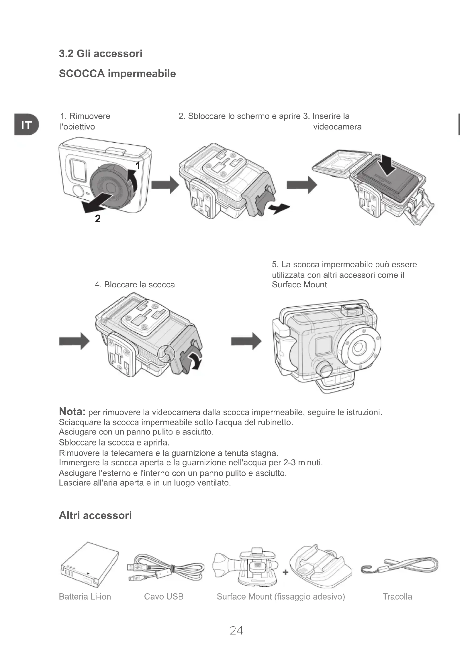 SCOCCA impermeabile Nota: per rimuovere la videocamera dalla scocca impermeabile, seguire le istruzioni. Sciacquare la scocca impermeabile sotto l'acqua del rubinetto. Asciugare con un panno pulito e asciutto. Sbloccare la scocca e aprirla. Rimuovere la telecamera e la guarnizione a tenuta stagna. Immergere la scocca aperta e la guarnizione nell'acqua per 2-3 minuti. Asciugare l'esterno e l'interno con un panno pulito e asciutto. Lasciare all'aria aperta e in un luogo ventilato. Altri accessori Batteria Li-ion Cavo USB Surface Mount (ssaggio adesivo) Tracolla