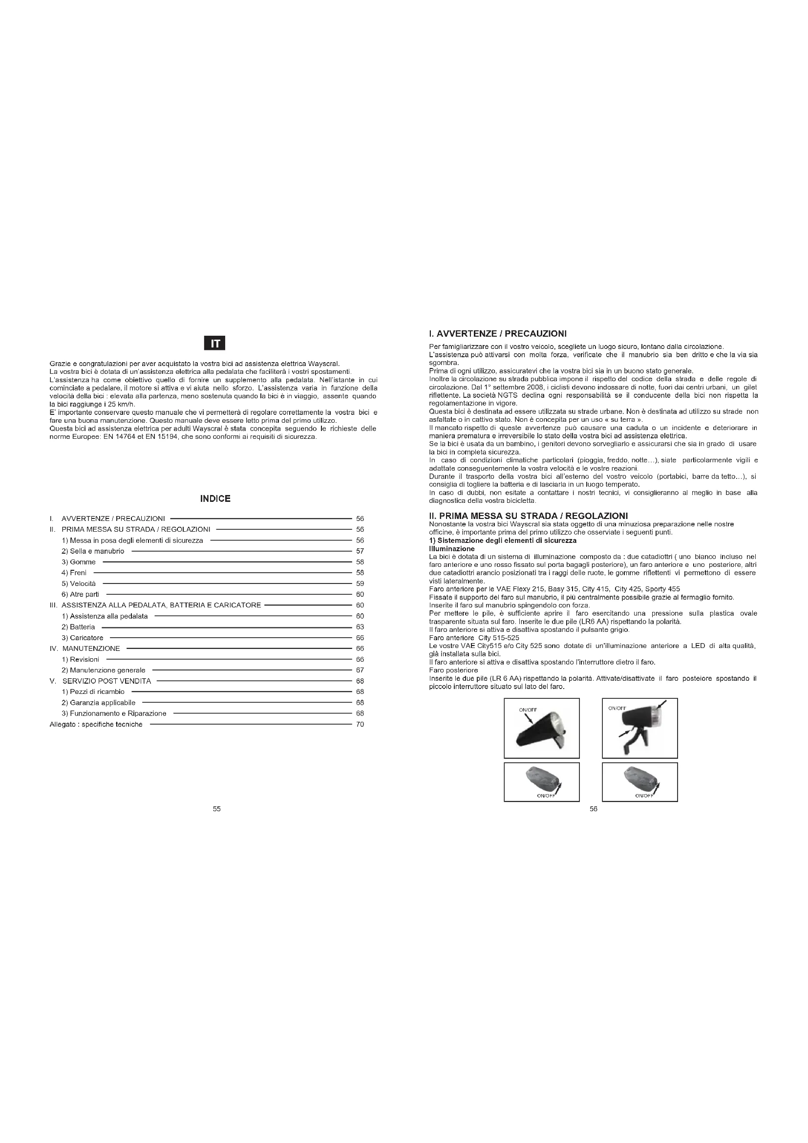La leva freno di destra attiva il vostro freno posteriore, quella di sinistra attiva il vostro freno anteriore. Si raccomanda di ripartire in media la vostra forza di frenata a 60/40 tra l’anteriore e il posteriore. La vostra bici Wayscral può essere dotata di 2 tipologie di freni. Freni V-brake Le ganasce devono chiudersi correttamente sul bordo dei cerchi. I pattini devono essere ad uguale distanza dal cerchio (circa: 3mm). Lo stato del cerchio incide fortemente sull’efficacia della frenata. Si consiglia quindi di pulirlo regolarmente. Occorre che possiate ottenere la potenza massima di frenata senza che le leve dei freni tocchino il manubrio. Se non è così, i vostri freni devono essere regolati. - Un sistema di dadi e di controdadi vi permette di regolare la forza di frenata che varierà nel tempo in funzione dell’usura dei pattini del freno. - La vite cruciforme con molla vi permetterà di compensare l’usura dei pattini e assicurare la buona posizione dei freni da una parte e dall’altra del cerchio. I pattini del freno sono standard, sostituiteli quando non sono più visibili. Regolazione per le City 515- City 525 Togliete il fermo premendo il pulsante nero in avanti poi aprite la vite di chiusura con una chiave esagonale Allen e alzate l’asta del manubrio all’altezza desiderata. Per regolare l’inclinazione del manubrio, togliete il fermo allo stesso modo e regolate il manubrio. Indossare un casco E' fortemente raccomandato indossare un casco da bici, in particolare per i bambini. Il casco garantisce una minore possibilità di incorrere in traumi cranici in caso di caduta. Per maggiori informazioni, rivolgetevi al vostro rivenditore.59 60 1.Battery indicator 2.Timer: hh 3.Timer: mm 5.Speed area 8.Power assist walk 5.Speed unit 7.Distance unit 4.Power lever 6.Distance Freni a disco I freni a disco non necessitano di manutenzione. Nonostante questo, fate attenzione a non gettare mai dell’olio o altri prodotti lubrificanti sul disco o sulle pastiglie, per esempio in occasione della manutenzione della catena o del deragliatore. Se questo succede, occorrerà cambiare le pastiglie, o sgrassarle. Avvertenza: in caso di pioggia le distanze di frenata si allungano.