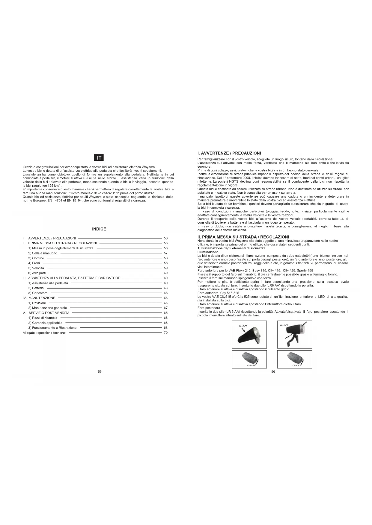 K65 66 Il numero di Km in autonomia dipende da diversi fattori di utilizzo : - la scelta della modalità di assistenza - il peso dell’utente - il dislivello della ruota - il gonfiaggio delle gomme - il vento - lo sforzo della pedalata fornito - l’avviamento e frequenza delle tappe - la temperatura esterna Precauzioni Si raccomanda di ricaricare le batterie regolarmente, o dopo ogni utilizzo. Non c’è nessun effetto memoria su queste batterie. Al fine di massimizzare la durata di vita della vostra batteria, si consiglia: - di evitare i luoghi caldi (temperatura di ricarica ideale 20C) - di lasciare raffreddare la batteria per 30 minuti dopo l’uso della bici Precauzioni d’uso : - Utilizzare la batteria unicamente per questa bici. - Per ricaricare la batteria utilizzare unicamente il caricatore specifico incluso - Ricaricare la batteria solo in un luogo ben ventilato. - Non esporre la batteria al calore e non ricaricarla in pieno sole. - Non smontare o modificare la batteria. - Non collegare le connessioni (+) e (-) della batteria ad un oggetto metallico - Non esporre la batteria a dei liquidi. - Non usare una batteria danneggiata. - Non continuare a ricaricare la batteria se la carica non è completa al termine del tempo di carica teorico. - Non utilizzare la batteria se emette un odore strano, scalda in maniera non normale o se qualcosa appare anomalo. - Non lasciare la batteria alla portata dei bambini. - Ricaricare la vostra batteria prima di un lungo inutilizzo e alla ripresa. Rispettate le istruzioni riportate sull’etichetta del caricatore della batteria. Per una ricarica completa occorrono da 4 a 6 ore. Quando la ricarica è terminata scollegate il caricatore. Non dimenticate di bloccare la vostra batteria dopo il suo riposizionamento sulla bici. Autonomia della vostra batteria La vostra batteria è soggetta a rodaggio. Avrà un’autonomia definitiva dopo una dozzina di utilizzi. Dopo la ricarica della vostra batteria, si consiglia di lasciarla riposare 20-30 minuti prima dell’utilizzo. L’autonomia della nostra VAE Wayscral è la seguente : Flexy 215, City 415, City 425 ,Sporty 455 ,City 515 et City 525: Batteria 36V6,6 Ah: 25-45 km Batteria 36V13,2 Ah: 60-80 km Basy 315: 25-40km Batteria Piombo 24V 10 Ah Rood: Oplading Groen : Opgeladen Durata di vita delle batterie Dopo un gran numero ricariche, le batterie possono soffrire di un peggioramento delle loro prestazioni. Questo dipende dalle abitudini di utilizzo della VAE. In linea generale, la capacità energetica sarà ridotta del 20-30% al termine di 500 cicli (ricarica e scaricamento) per le batterie al litio e di 300 cicli per le batterie al piombo. Dovrete consegnare le vostre batterie usate al negozio in cui avete acquistato la bici oppure nei punti di raccolta specializzati in riciclaggio. Sopratutto non gettate le vostre batterie nella natura.