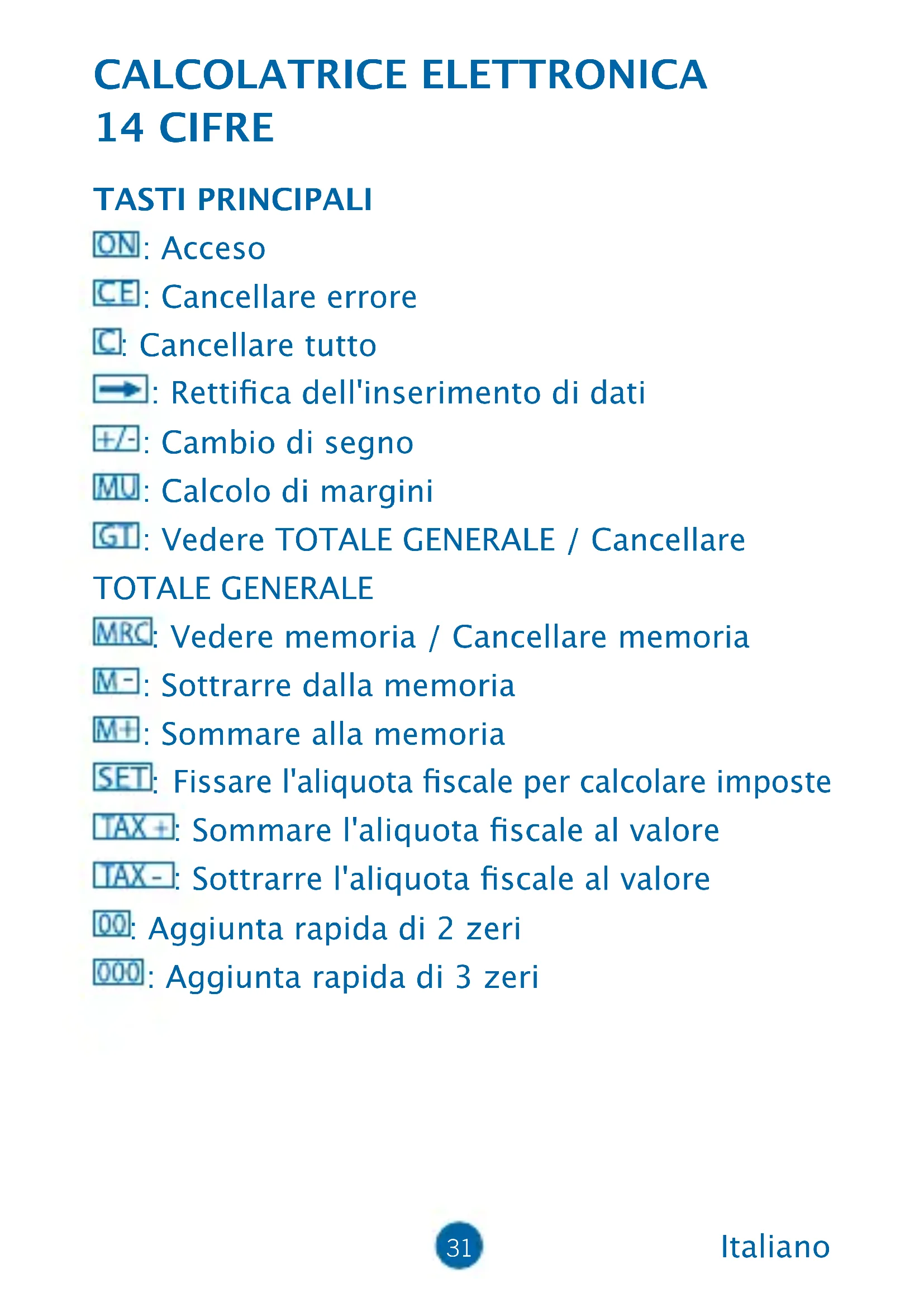Fissare l'aliquota scale per calcolare imposte : Sommare l'aliquota scale al valore : Sottrarre l'aliquota scale al valore : Aggiunta rapida di 2 zeri : Aggiunta rapida di 3 zeri Italiano32 DESCRIZIONE DEI SETTORI: