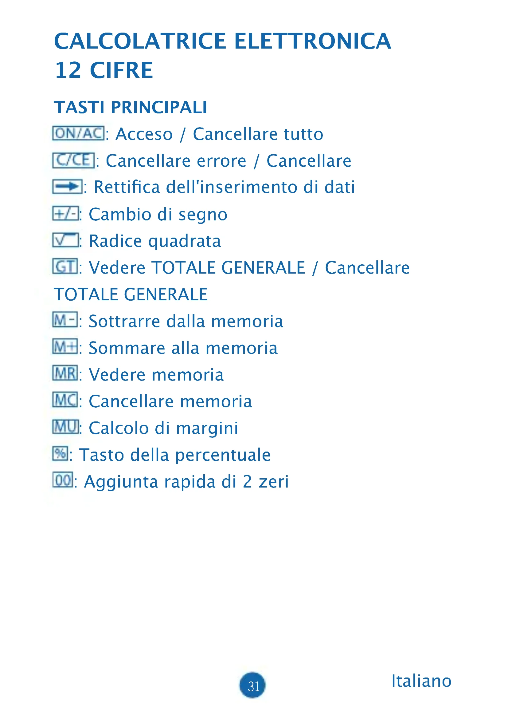 loqui la tapa i cargoli-la (sense pressionar massa). (5) Apagament automàtic: Aproximadament després de 8 minuts.31 Italiano CALCOLATRICE ELETTRONICA 12 CIFRE TASTI PRINCIPALI : Acceso / Cancellare tutto : Cancellare errore / Cancellare : Rettica dell'inserimento di dati : Cambio di segno : Radice quadrata : Vedere TOTALE GENERALE / Cancellare TOTALE GENERALE : Sottrarre dalla memoria : Sommare alla memoria : Vedere memoria : Cancellare memoria : Calcolo di margini : Tasto della percentuale : Aggiunta rapida di 2 zeri32 DESCRIZIONE DEI SETTORI: