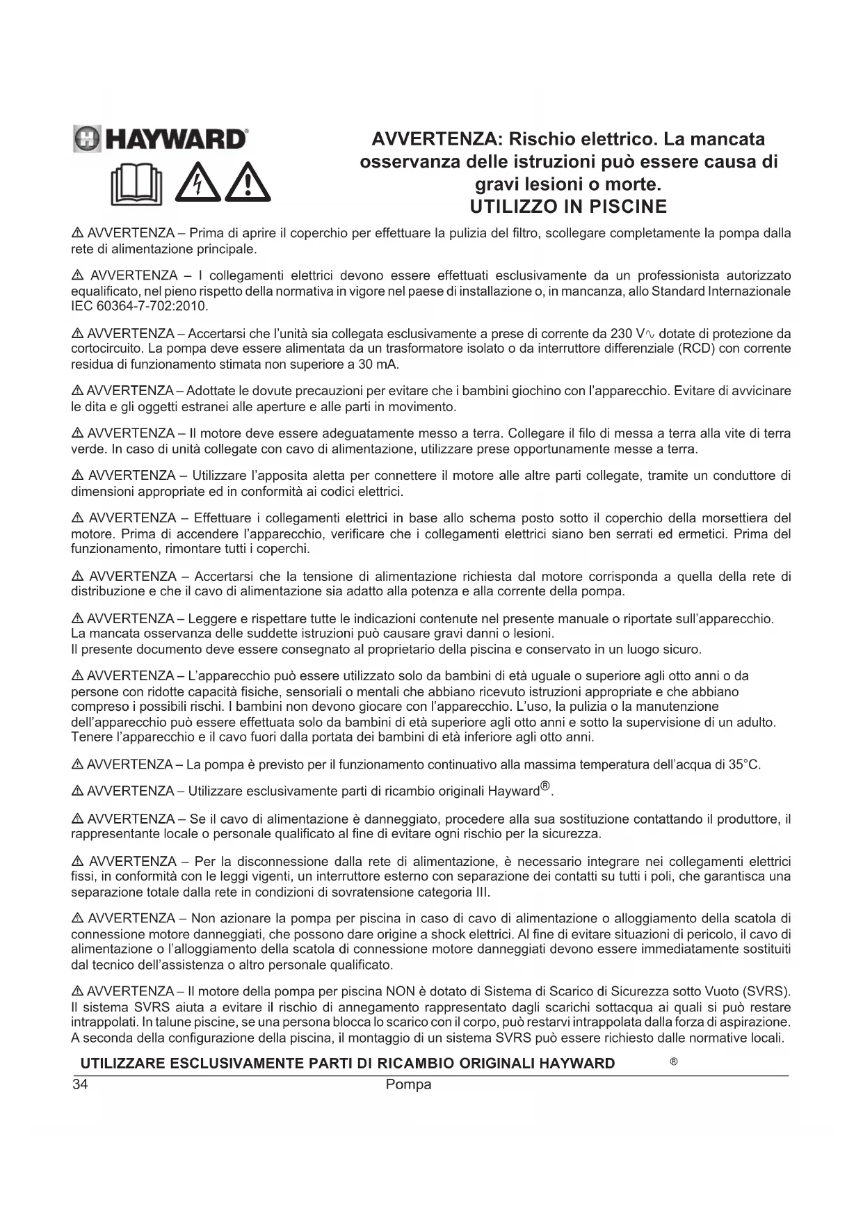 - AVVERTENZA – Utilizzare esclusivamente parti di ricambio originali Hayward