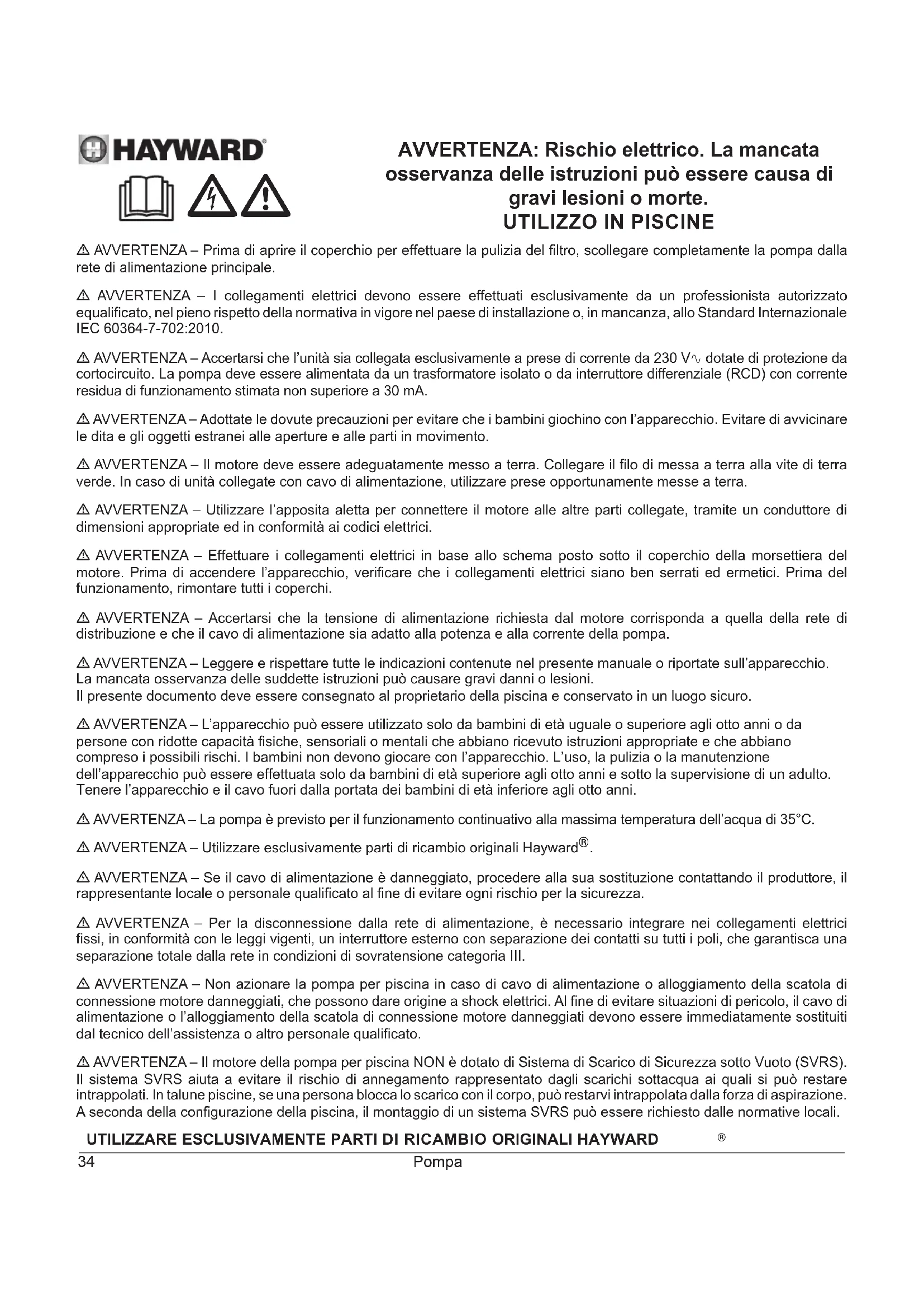 - AVVERTENZA – Utilizzare esclusivamente parti di ricambio originali Hayward