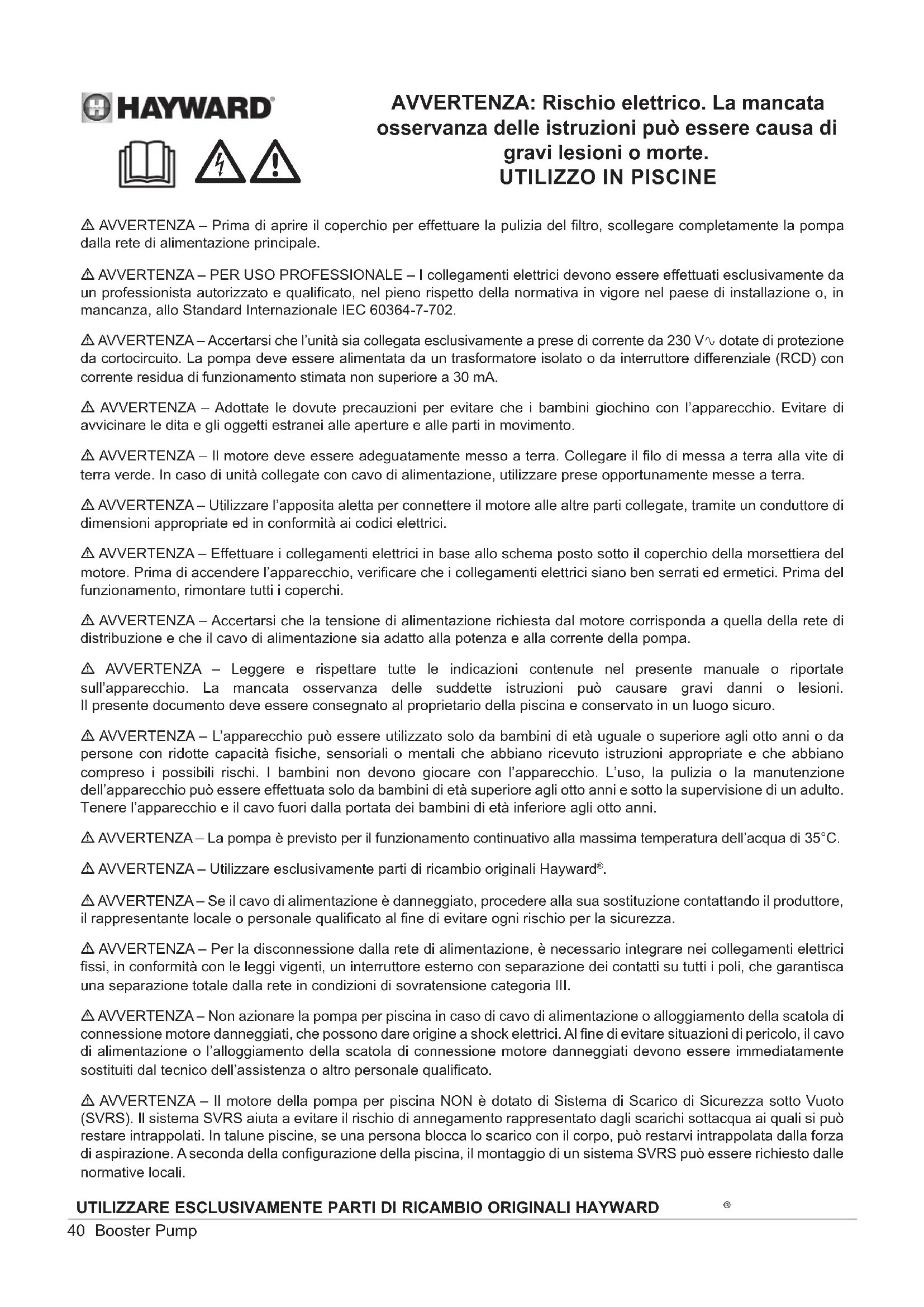 Scarica le istruzioni per il tuo Pompa in formato PDF gratuitamente! Trova il tuo manuale Booster - HAYWARD e riprendi in mano il tuo dispositivo elettronico. In questa pagina sono pubblicati tutti i documenti necessari per l'utilizzo del tuo dispositivo. Booster del marchio HAYWARD.