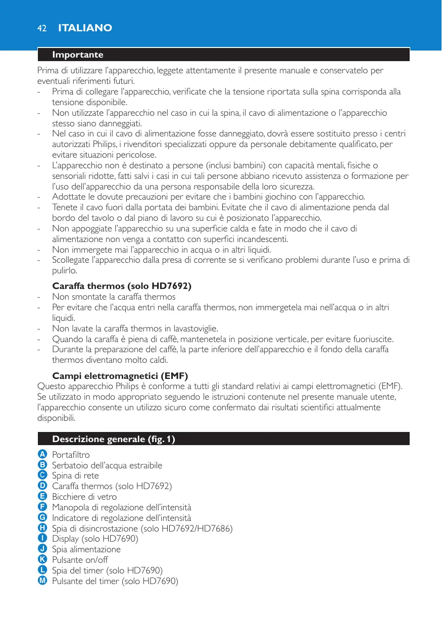 Caraffa thermos (solo HD7692) Non smontate la caraffa thermos Per evitare che l’acqua entri nella caraffa thermos, non immergetela mai nell’acqua o in altri liquidi. Non lavate la caraffa thermos in lavastoviglie. Quando la caraffa è piena di caffè, mantenetela in posizione verticale, per evitare fuoriuscite. Durante la preparazione del caffè, la parte inferiore dell’apparecchio e il fondo della caraffa thermos diventano molto caldi. Campi elettromagnetici (EMF) Questo apparecchio Philips è conforme a tutti gli standard relativi ai campi elettromagnetici (EMF). Se utilizzato in modo appropriato seguendo le istruzioni contenute nel presente manuale utente, l’apparecchio consente un utilizzo sicuro come confermato dai risultati scientifici attualmente disponibili. Descrizione generale (fig. 1)