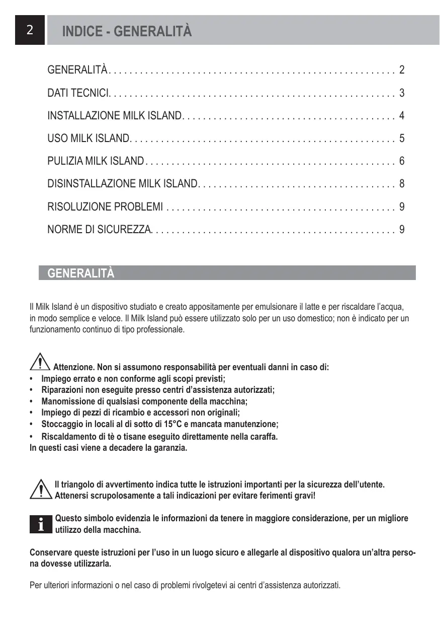 Il Milk Island è un dispositivo studiato e create appositamente per emulsionare il latte e per riscaldare l'acqua, in modo semplice e velocce. Il Milk Island può essere utilizzato solo per un uso domestico; non è indicato per un funzionamento continuo di tipo professionale.