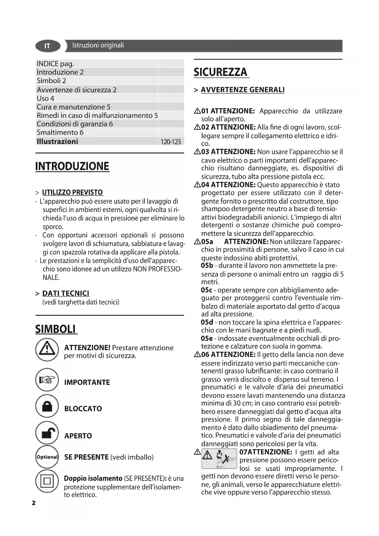 INDICE pag. Introduzione 2 Simboli 2 Avvertenze di sicurezza 2 Uso 4 Cura e manutenzione 5 Rimedi in caso di malfunzionamento 5 Condizioni di garanzia 6 Smaltimento 6 Illustrazioni 120-123 INTRODUZIONE > UTILIZZO PREVISTO