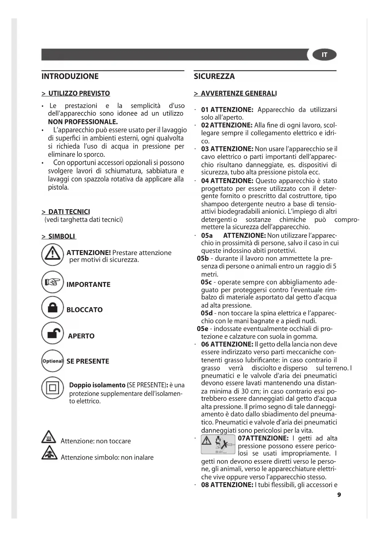 - Conopportuniaccessoriopzionalisipossono svolgere lavori di schiumatura, sabbiatura e lavaggi con spazzola rotativa da applicare alla pistola. > DATI TECNICI (vedi targhetta dati tecnici) > SIMBOLI ATTENZIONE! Prestare attenzione per motivi di sicurezza. IMPORTANTE BLOCCATO APERTO SE PRESENTE Doppio isolamento (SE PRESENTE): è una protezione supplementare dell’isolamen- to elettrico. Attenzione: non toccare Attenzione simbolo: non inalare SICUREZZA > AVVERTENZE GENERALI