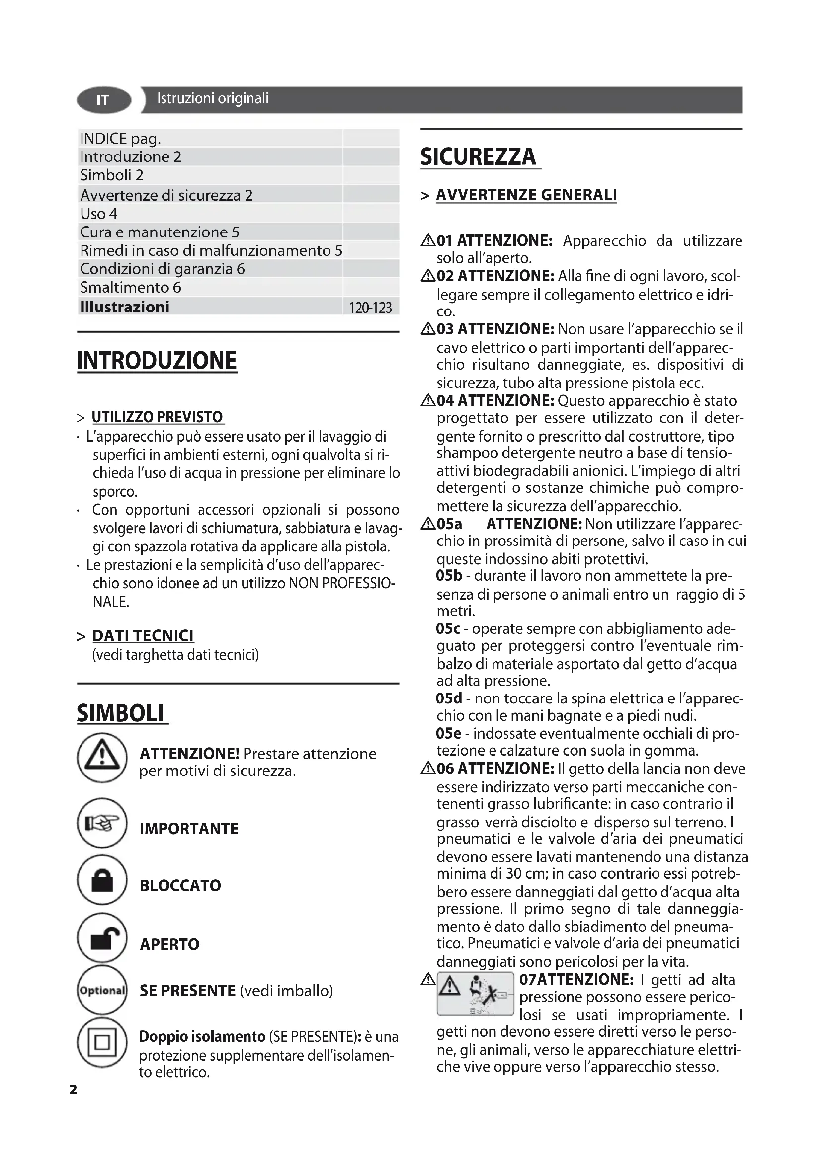 INDICE pag. Introduzione 2 Simboli 2 Avvertenze di sicurezza 2 Uso 4 Cura e manutenzione 5 Rimedi in caso di malfunzionamento 5 Condizioni di garanzia 6 Smaltimento 6 Illustrazioni 120-123 INTRODUZIONE > UTILIZZO PREVISTO