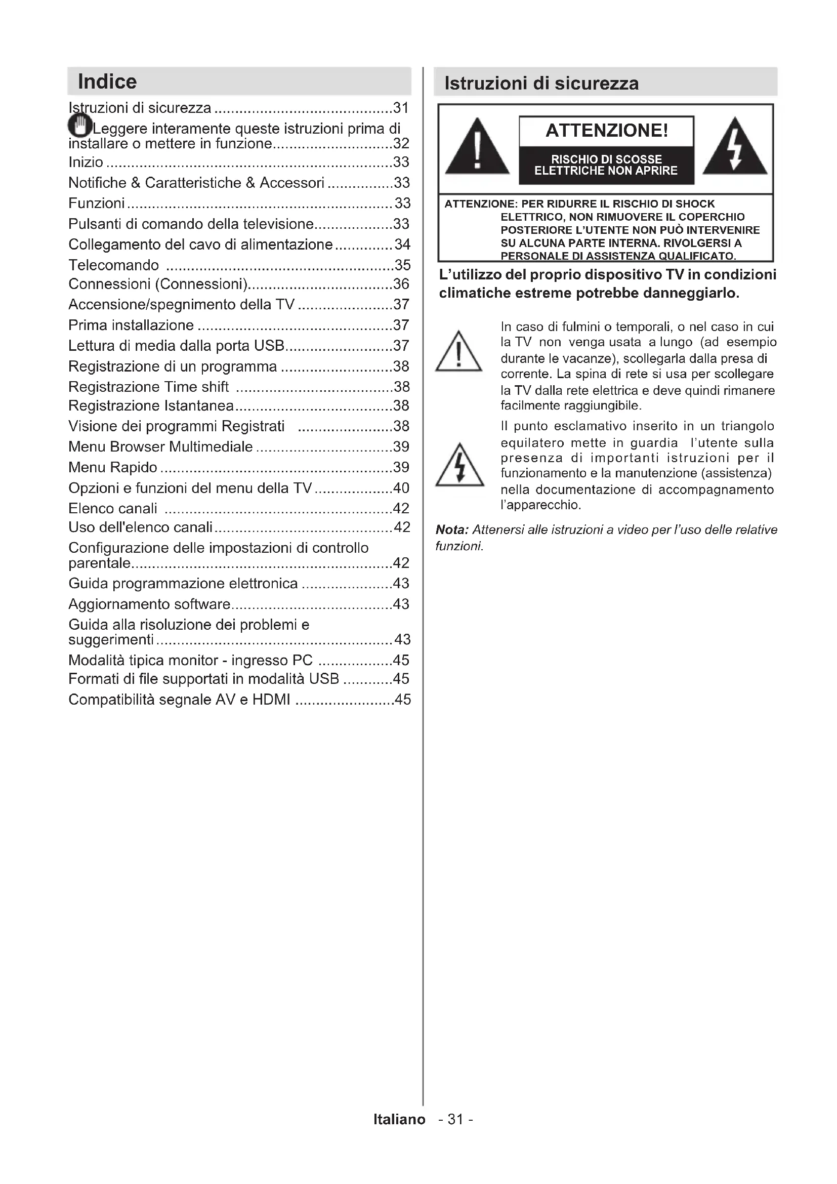 - Compatibilità segnale AV e HDMI Istruzioni di sicurezza L’utilizzo del proprio dispositivo TV in condizioni climatiche estreme potrebbe danneggiarlo. ATTENZIONE! RISCHIO DI SCOSSE ELETTRICHE NON APRIREATTENZIONE: PER RIDURRE IL RISCHIO DI SHOCK ELETTRICO, NON RIMUOVERE IL COPERCHIO POSTERIORE L’UTENTE NON PUÒ INTERVENIRE SU ALCUNA PARTE INTERNA. RIVOLGERSI A PERSONALE DI ASSISTENZA QUALIFICATO.Nota: Attenersi alle istruzioni a video per l’uso delle relative funzioni.In caso di fulmini o temporali, o nel caso in cui la TV non venga usata a lungo (ad esempio durante le vacanze), scollegarla dalla presa di corrente. La spina di rete si usa per scollegare la TV dalla rete elettrica e deve quindi rimanere facilmente raggiungibile.Il punto esclamativo inserito in un triangolo equilatero mette in guardia l’utente sulla presenza di importanti istruzioni per il funzionamento e la manutenzione (assistenza) nella documentazione di accompagnamento l’apparecchio.Italiano - 32 - p. 45