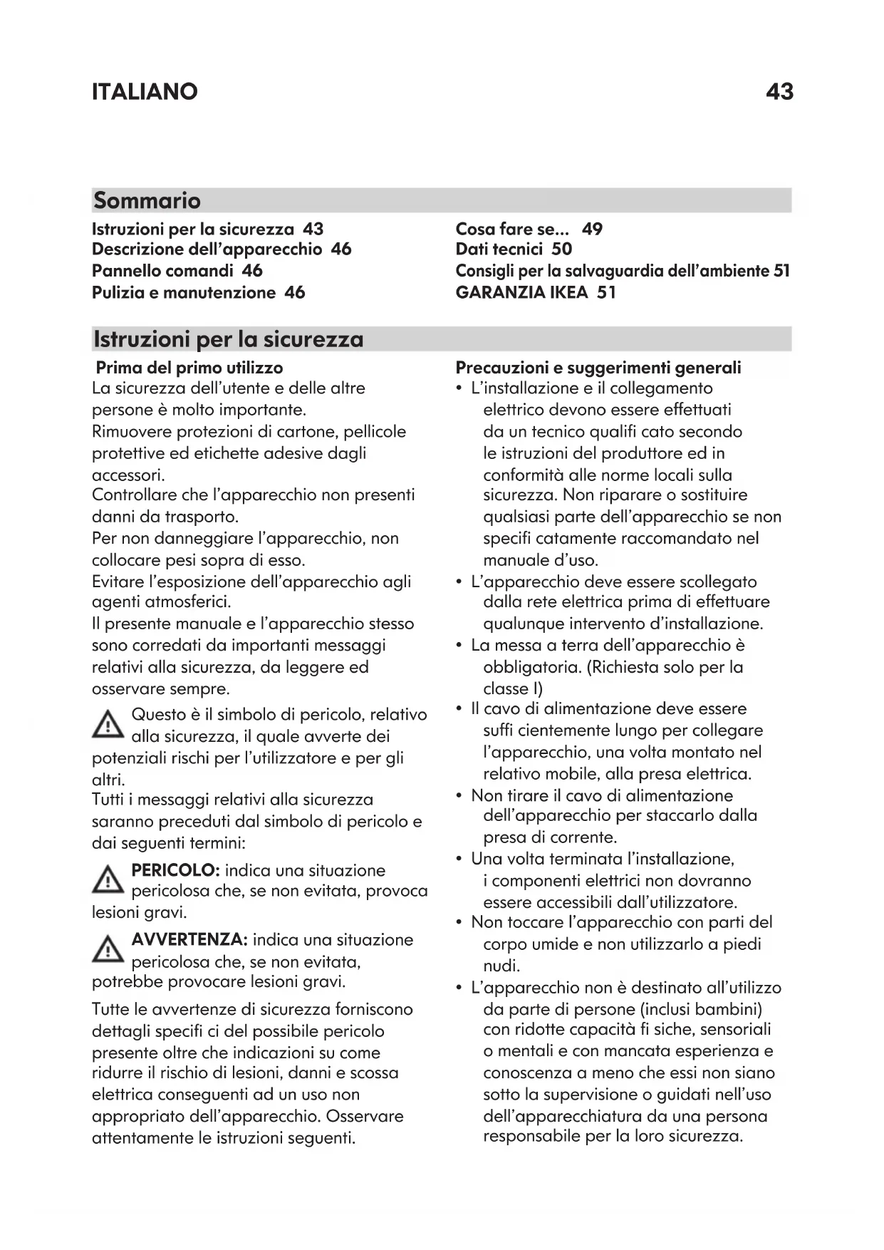 GARANZIA IKEA 51 Istruzioni per la sicurezza SommarioITALIANO 44
