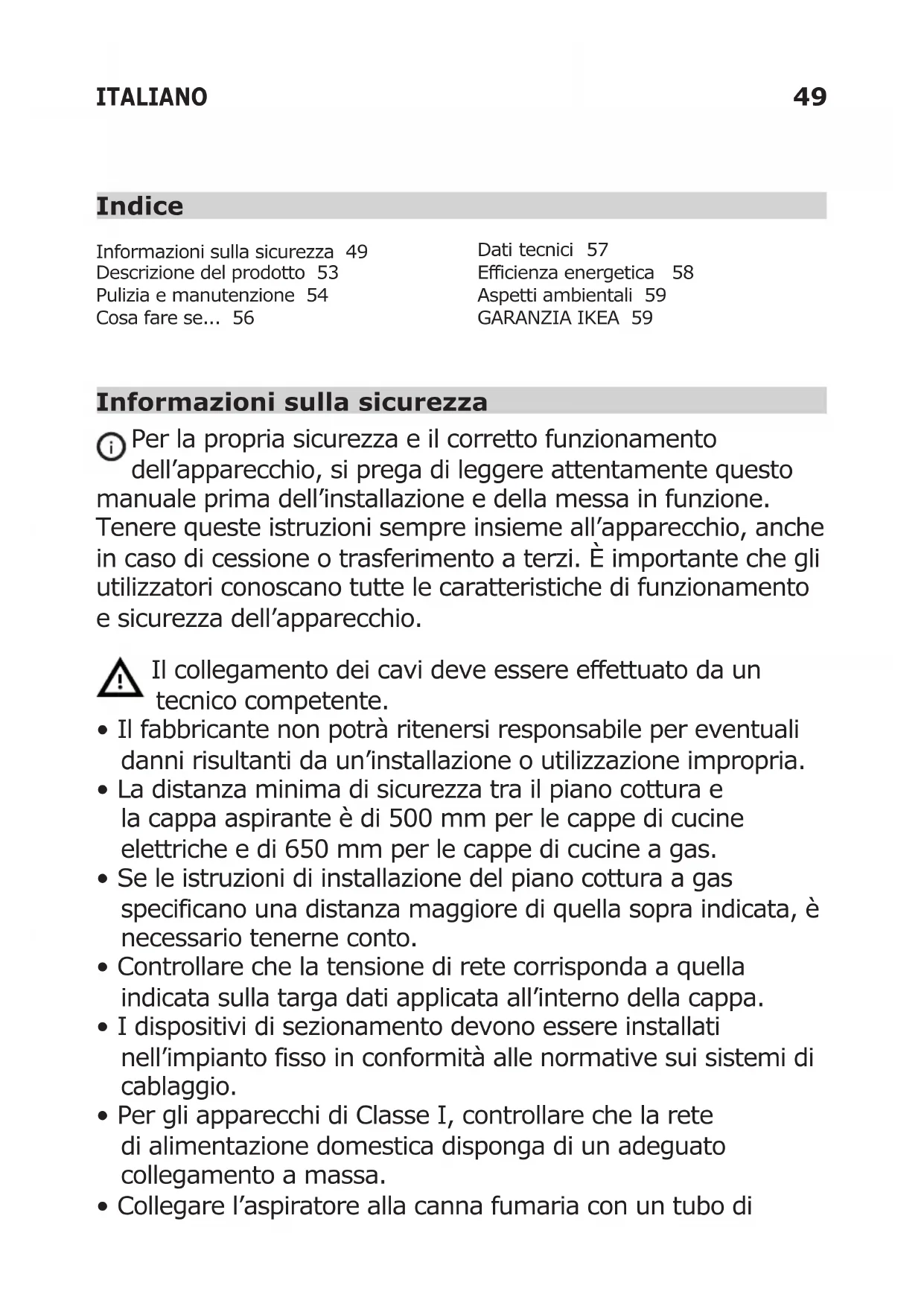 Consumo energetico annuale kWh/a 39,0 Coefciente di incremento del tempo 0,6 Efcienza uidodinamica 37,6 Indice di efcienza energetica 39,9 Portata d'aria misurata nel punto di efcienza migliore m3/h 384,0 Pressione dell'aria misurata nel punto di efcienza migliore Pa 486 Portata d'aria massima m3/h 710,0 Alimentazione elettrica misurata nel punto di efcienza migliore W 138,0 Potenza nominale del sistema di illuminazione W 12,0 Illuminazione media del sistema di illuminazione sul piano cottura lux 400 Consumo di corrente misurato in modalità standby W N/D Consumo di corrente misurato in modalità off W 0,49 Livello sonoro a velocità massima (senza impostazione intensiva) dBA 6059 ITALIANO GARANZIA IKEA Per quanto è valida la garanzia IKEA? Questa garanzia è valida per cinque (5) anni dalla data originale di acqui- sto dell’apparecchio presso IKEA. Lo scontrino originale è indispensabile come ricevuta d’acquisto. Una riparazio- ne effettuata nell’ambito della garanzia non estende il periodo di garanzia per l’apparecchio. Chi fornisce il servizio ai clienti? L’assistenza ai clienti sarà garantita dal for- nitore del servizio nominato da IKEA attra- verso la propria organiz- zazione o la propria rete di partner di assistenza autorizza ti. Cosa copre la garanzia? La garanzia copre gli eventuali difetti legati ai materiali e o alla costruzio- ne dell’elettrodomestico ed è valida a partire dalla data di acquisto dell’elet- trodomestico presso un punto vendi- ta IKEA. La garanzia è valida solo su elettrodomestici destinati all’impiego domestico. Le eccezioni sono descritte alla voce “Cosa non copre la garanzia”. Nel periodo di validità della garanzia, il fornitore del servizio nominato da IKEA sosterrà i costi per la riparazione, i pezzi di ricambio, la manodopera e le trasferte del personale di manutenzione, ammesso che il prodotto possa essere riparato senza costi troppo elevati e che il difetto legato ai materiali o alla costru- zione rientri nella copertura dell garan- zia. Queste condizioni sono conformi alle direttive EU (N. 99/44/CE) e alle norme e disposizioni locali applicabili. Le parti sostituite diventeranno di proprietà di IKEA. Come interverrà IKEA per risolvere il problema? Il fornitore del servizio nominato da IKEA esaminerà il prodotto e deciderà a propria esclusiva discrezione se lo stes- so rientra nella copertura della garanzia. In caso affermativo, il fornitore del ser- Aspetti ambientali Manutenzione