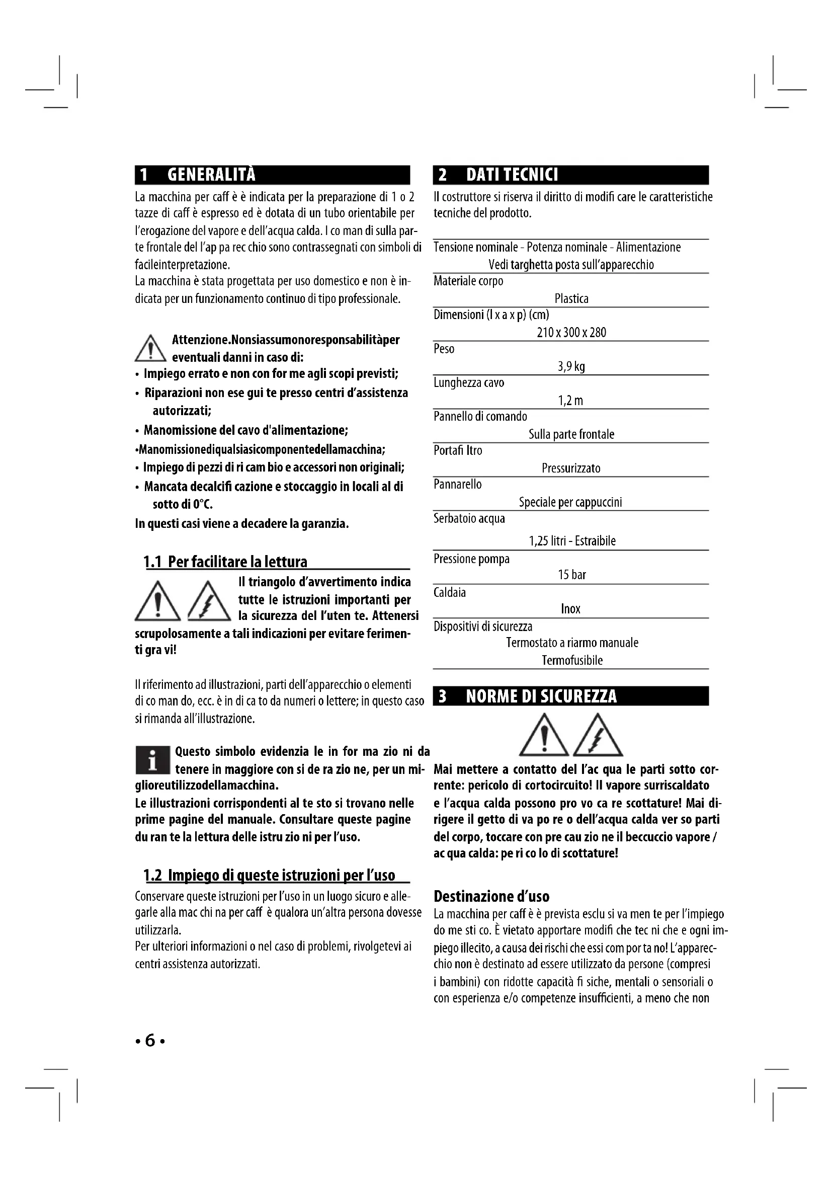Conservare queste istruzioni per l’uso in un luogo sicuro e alle- garle alla mac chi na per ca è qualora un’altra persona dovesse utilizzarla. Per ulteriori informazioni o nel caso di problemi, rivolgetevi ai centri assistenza autorizzati. 2 DATI TECNICI Il costruttore si riserva il diritto di modi care le caratteristiche tecniche del prodotto. Tensione nominale - Potenza nominale - Alimentazione Vedi targhetta posta sull’apparecchio Materiale corpo Plastica Dimensioni (l x a x p) (cm) 210 x 300 x 280 Peso 3,9 kg Lunghezza cavo 1,2 m Pannello di comando Sulla parte frontale Porta ltro Pressurizzato Pannarello Speciale per cappuccini Serbatoio acqua 1,25 litri - Estraibile Pressione pompa 15 bar Caldaia Inox Dispositivi di sicurezza Termostato a riarmo manuale Termofusibile