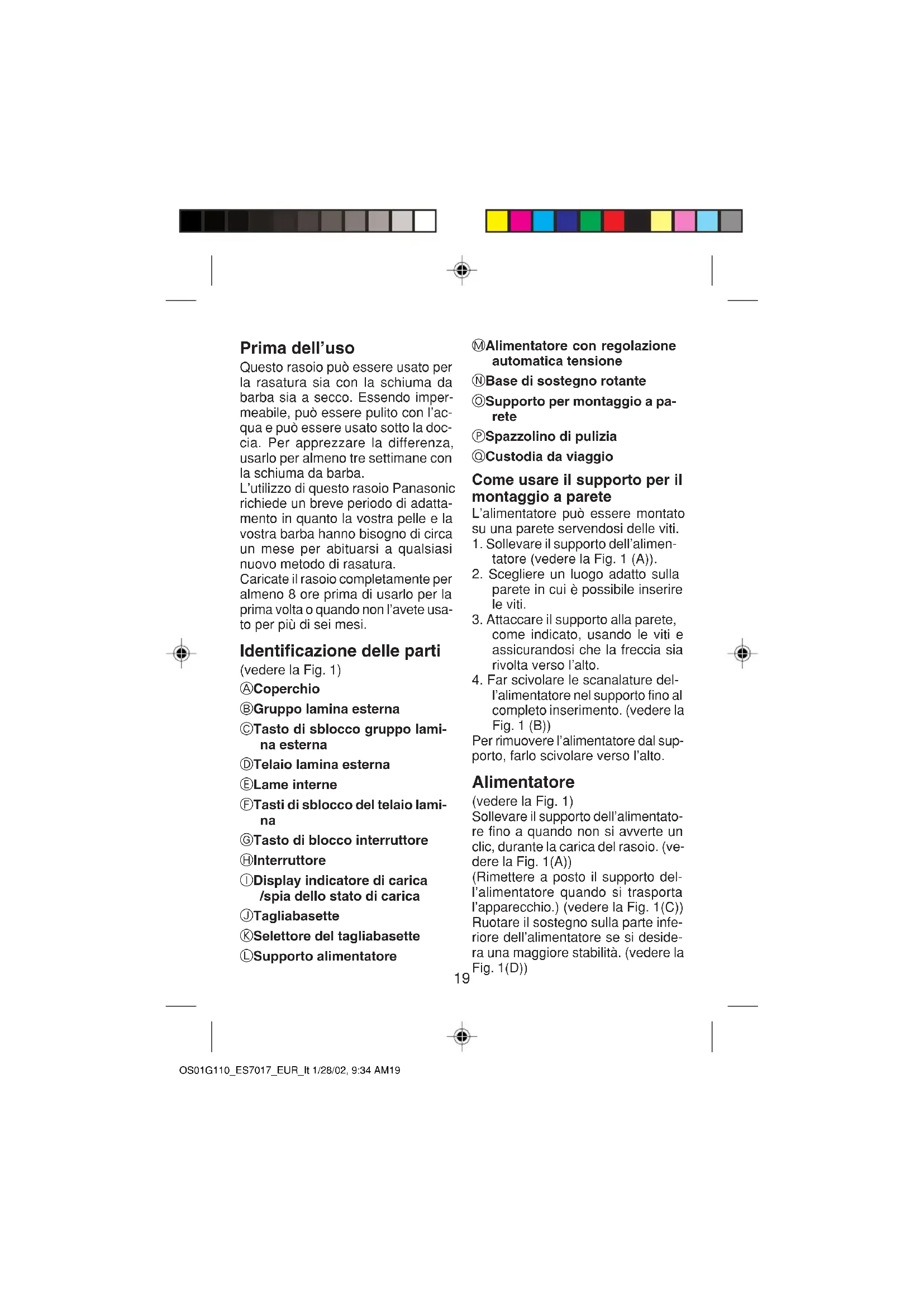 - Utilisez ce rasoir conformément à l’usage prévu et aux instructions du mode d’emploi. Utilisation domestique uniquement. OS01G110_ES7017_EUR_Fr 1/28/02, 9:34 AM1819 Prima dell’uso Questo rasoio può essere usato per la rasatura sia con la schiuma da barba sia a secco. Essendo imper- meabile, può essere pulito con l’ac- qua e può essere usato sotto la doc- cia. Per apprezzare la differenza, usarlo per almeno tre settimane con la schiuma da barba. L’utilizzo di questo rasoio Panasonic richiede un breve periodo di adatta- mento in quanto la vostra pelle e la vostra barba hanno bisogno di circa un mese per abituarsi a qualsiasi nuovo metodo di rasatura. Caricate il rasoio completamente per almeno 8 ore prima di usarlo per la prima volta o quando non l’avete usa- to per più di sei mesi. Identificazione delle parti (vedere la Fig. 1) A Coperchio B Gruppo lamina esterna C Tasto di sblocco gruppo lami- na esterna D Telaio lamina esterna E Lame interne F Tasti di sblocco del telaio lami-