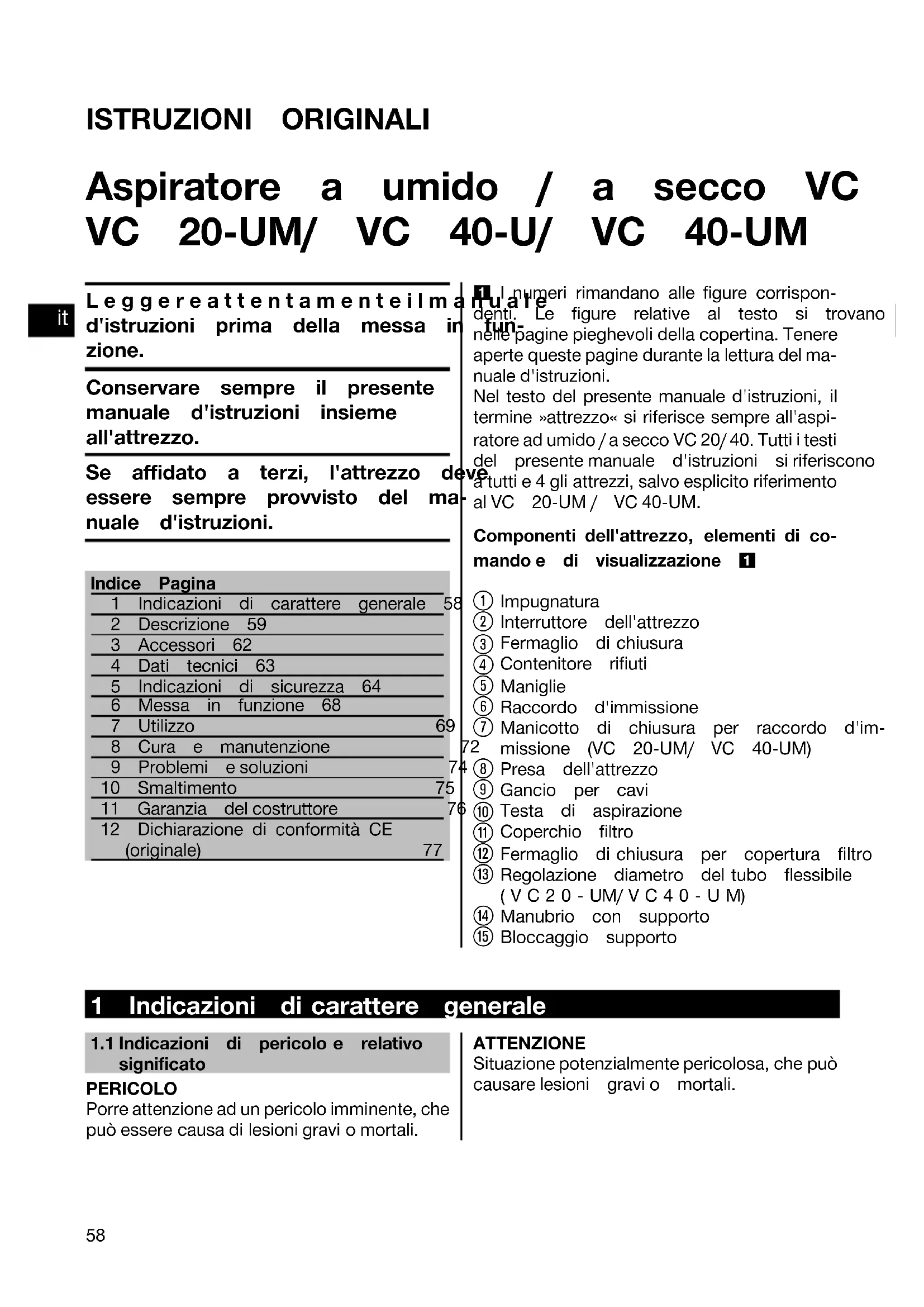 Printed: 08.07.2013 | Doc-Nr: PUB / 5071294 / 000 / 02ISTRUZIONI ORIGINALI Aspiratore a umido / a secco VC 20‑U/ VC 20‑UM/ VC 40‑U/ VC 40‑UM Leggereattentamenteilmanualed'istruzioni prima della messa in fun-zione.Conservare sempre il presentemanuale d'istruzioni insiemeall'attrezzo.Se affidato a terzi, l'attrezzo deveessere sempre provvisto del ma-nuale d'istruzioni.Indice Pagina1 Indicazioni di carattere generale 582 Descrizione 593 Accessori 624 Dati tecnici 635 Indicazioni di sicurezza 646 Messa in funzione 687 Utilizzo 698 Cura e manutenzione 729 Problemi e soluzioni 7410 Smaltimento 7511 Garanzia del costruttore 7612 Dichiarazione di conformità CE(originale) 77 1 I numeri rimandano alle figure corrispon- denti. Le figure relative al testo si trovano nelle pagine pieghevoli della copertina. Tenere aperte queste pagine durante la lettura del ma- nuale d'istruzioni. Nel testo del presente manuale d'istruzioni, il termine »attrezzo« si riferisce sempre all'aspi- ratore ad umido / a secco VC 20/ 40. Tutti i testi del presente manuale d'istruzioni si riferiscono a tutti e 4 gli attrezzi, salvo esplicito riferimento al VC 20‑UM / VC 40‑UM. Componenti dell'attrezzo, elementi di co- mando e di visualizzazione 1 Impugnatura Interruttore dell'attrezzo Fermaglio di chiusura Contenitore rifiuti Maniglie Raccordo d'immissione Manicotto di chiusura per raccordo d'im-missione (VC 20‑UM/ VC 40‑UM) Presa dell'attrezzo Gancio per cavi Testa di aspirazione Coperchio filtro Fermaglio di chiusura per copertura filtro Regolazione diametro del tubo flessibile(VC20‑UM/VC40‑UM) Manubrio con supporto Bloccaggio supporto 1 Indicazioni di carattere generale