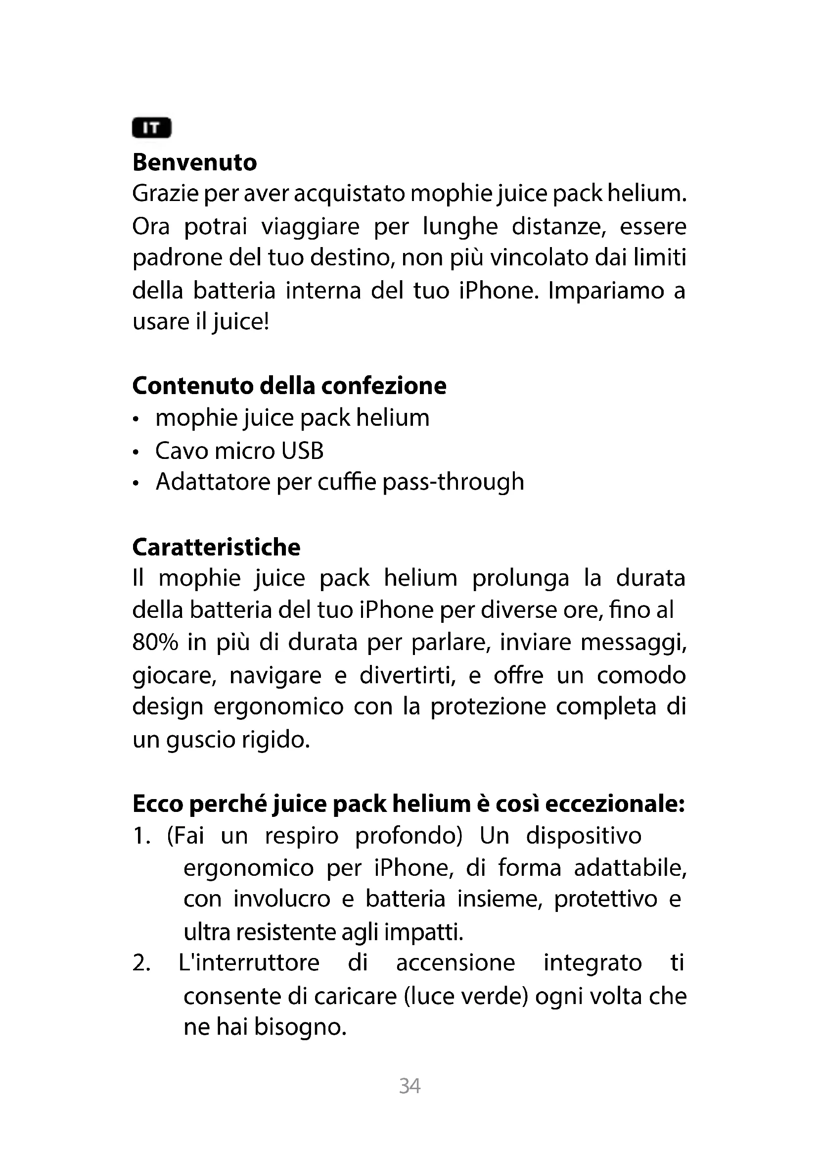Grazie per aver acquistato mophie juice pack helium. Ora potrai viaggiare per lunghe distance, essere padrone del tuo destino, non più vincolato dai limiti della batteria interna del loro iPhone. Impariamo a usare il juice!