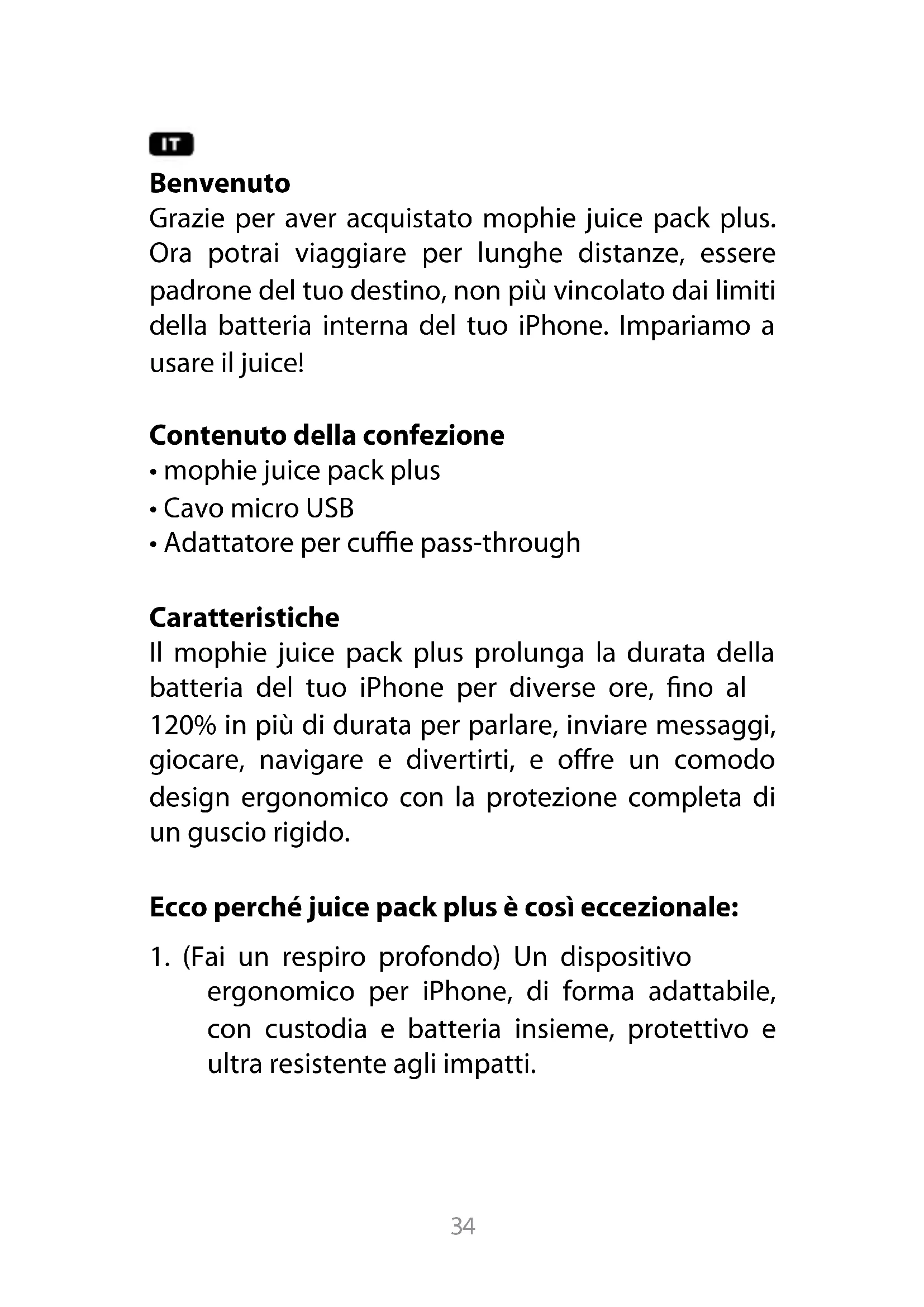Grazie per aver acquistato mophie juice pack plus. Ora potrai viaggiare per lunghe distance, essere padrone del tuo destino, non più vincolato dai limiti della batteria interna del loro iPhone. Impariamo a usare il juice!