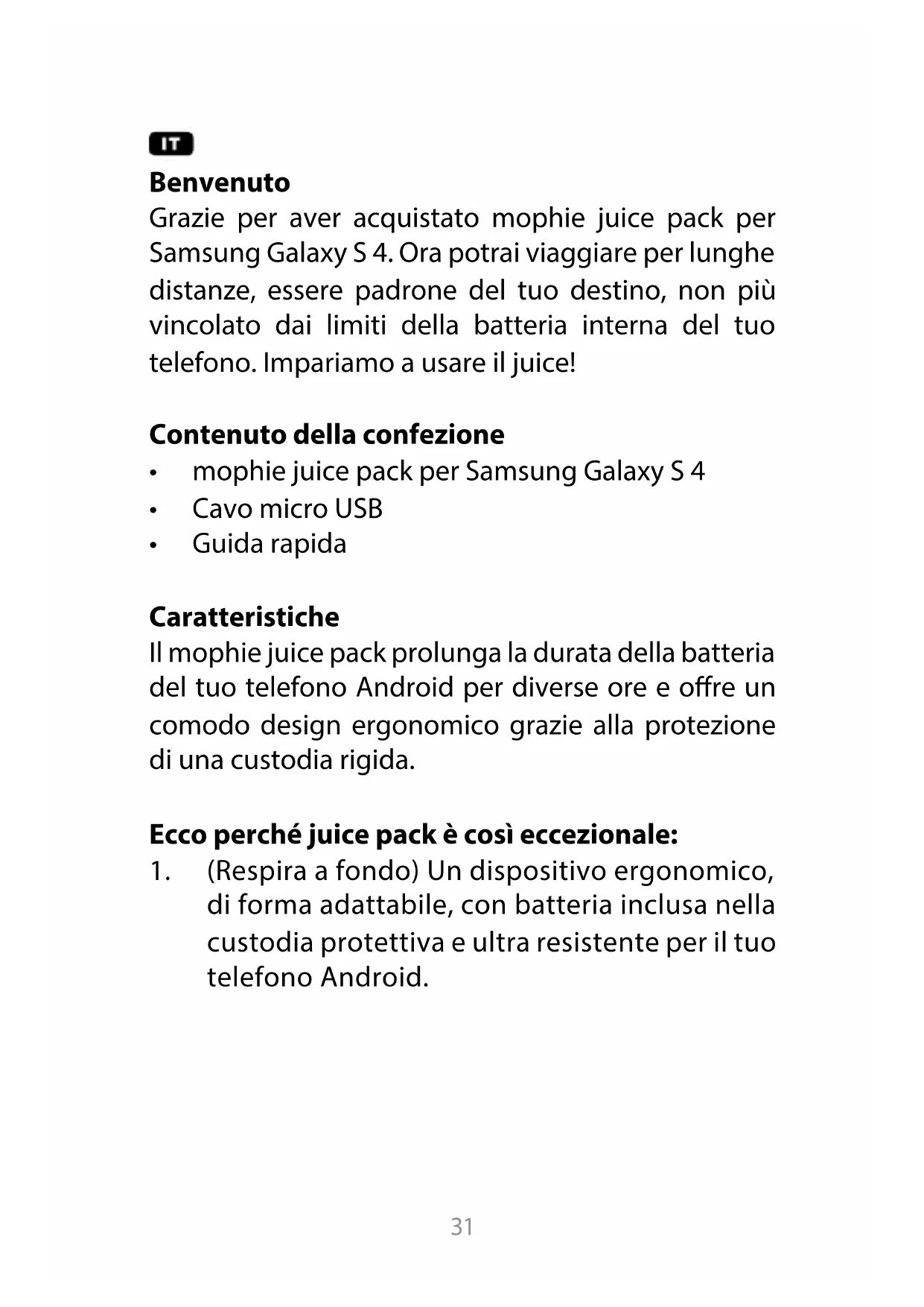 Grazie per aver acquistato mophie juice pack per Samsung Galaxy S 4. Ora potrai viaggiare per lunghe distance, essere padrone del loro destino, non più vincolato dai limiti della batteria interna del loro Telefono. Impariamo a usare il juice!