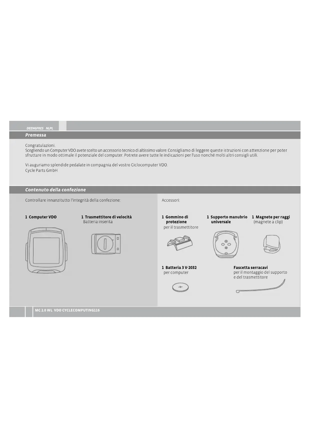 Premessa Congratulazioni. Scegliendo un Computer VDO avete scelto un accessorio tecnico di altissimo valore. Consigliamo di leggere queste istruzioni con attenzione per poter sfruttare in modo ottimale il potenziale del computer. Potrete avere tutte le indicazioni per l'uso nonché molti altri consigli utili. Vi auguriamo splendide pedalate in compagnia del vostro Ciclocomputer VDO. Cycle Parts GmbH Contenuto della confezione Controllare innanzitutto l’integrità della confezione: 1 Computer VDO Accessori: 1 Trasmettitore di velocità Batteria inserita 1 Supporto manubrio universale 1 Magnete per raggi (magnete a clip) 1 Batteria 3 V-2032 per computer Fascetta serracavi per il montaggio del supporto e del trasmettitore 1 Gommino di protezione per il trasmettitoreITNLPL FRES ENG DE www.vdocyclecomputing.com MC 2.0 WL 117 Indice