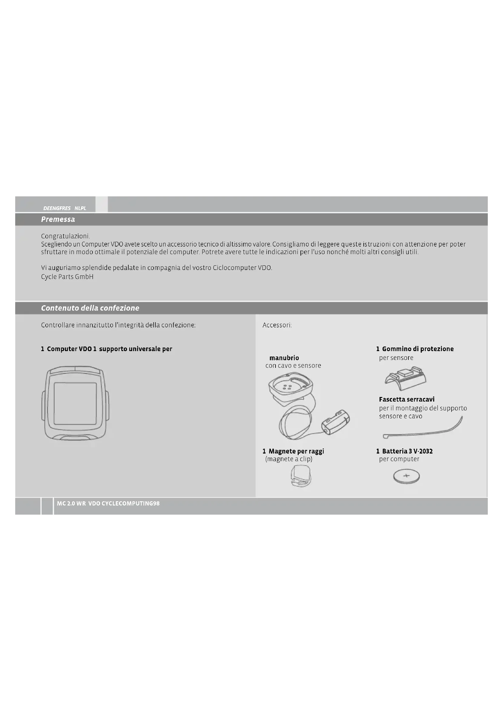 Premessa Congratulazioni. Scegliendo un Computer VDO avete scelto un accessorio tecnico di altissimo valore. Consigliamo di leggere queste istruzioni con attenzione per poter sfruttare in modo ottimale il potenziale del computer. Potrete avere tutte le indicazioni per l’uso nonché molti altri consigli utili. Vi auguriamo splendide pedalate in compagnia del vostro Ciclocomputer VDO. Cycle Parts GmbH Contenuto della confezione Controllare innanzitutto l’integrità della confezione: 1 Computer VDO 1 supporto universale per manubrio con cavo e sensore Accessori: 1 Magnete per raggi (magnete a clip) Fascetta serracavi per il montaggio del supporto sensore e cavo 1 Gommino di protezione per sensore 1 Batteria 3 V-2032 per computerITNLPL FRES ENG DE www.vdocyclecomputing.com MC 2.0 WR 99 Indice