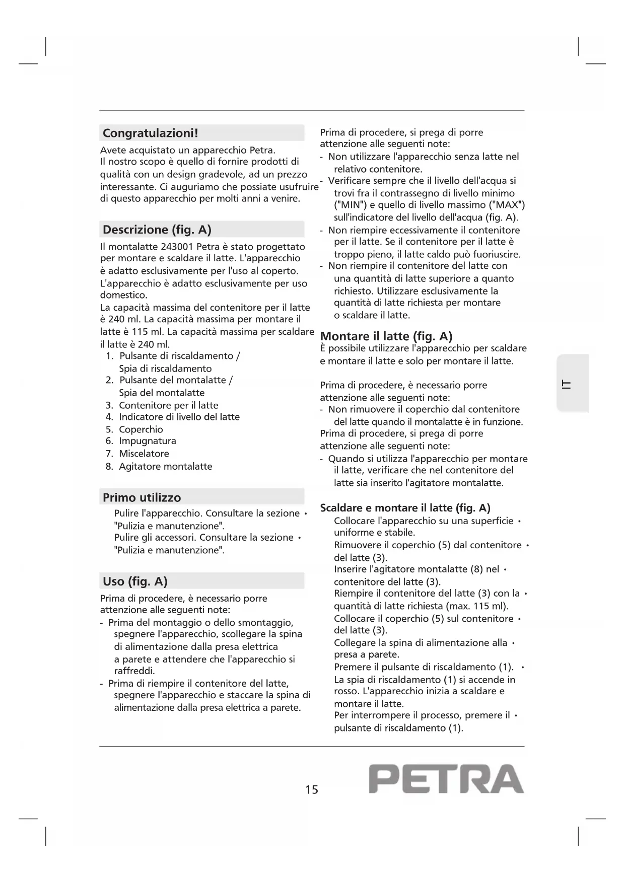 Congratulazioni! Avete acquistato un apparecchio Petra. Il nostro scopo è quello di fornire prodotti di qualità con un design gradevole, ad un prezzo interessante. Ci auguriamo che possiate usufruire di questo apparecchio per molti anni a venire. Descrizione (fig. A) Il montalatte 243001 Petra è stato progettato per montare e scaldare il latte. L'apparecchio è adatto esclusivamente per l'uso al coperto. L'apparecchio è adatto esclusivamente per uso domestico. La capacità massima del contenitore per il latte è 240 ml. La capacità massima per montare il latte è 115 ml. La capacità massima per scaldare il latte è 240 ml.