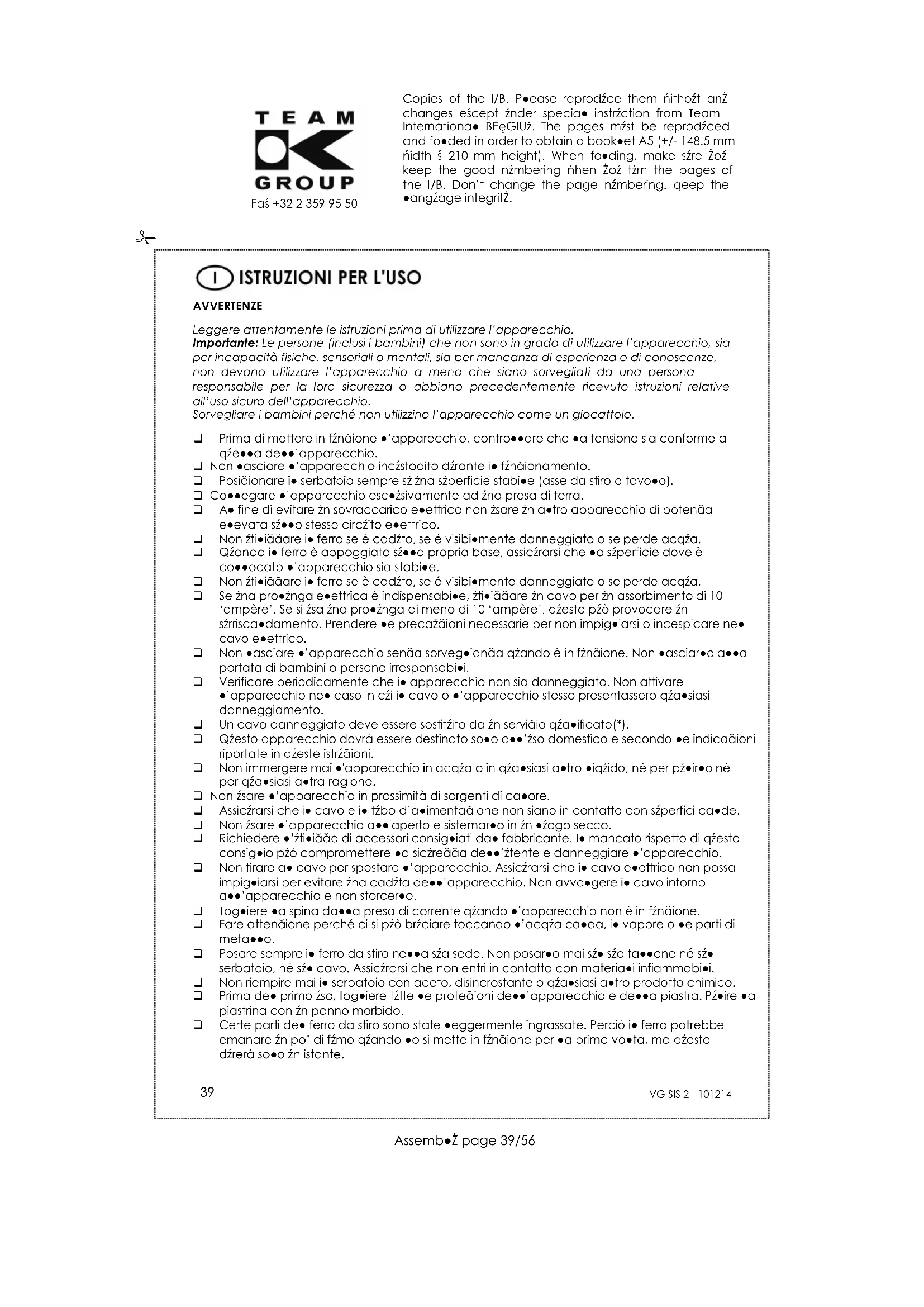 Fax +32 2 359 95 50 Utilizzare e porre sempre il ferro in una superficie stabile. Non utilizzare il ferro se è caduto, se é visibilmente danneggiato o se perde acqua. Quando si pone il ferro sul proprio supporto (a seconda del modello), controllare che la superficie sulla quale si pone il supporto é stabile. Procedere nello stesso modo se il serbatoio smette di funzionare o se è danneggiato. Per evitare una pericolosa scarica elettrica, non smontare il ferro da stiro né il serbatoio: portare l’apparecchio sempre ad un tecnico qualificato affinché lo esamini. Un’installazione non corretta può essere molto pericolosa poiché durante il funzionamento del ferro o della caldaia potrebbe dare origine ad una scarica elettrica. Svolgere interamente il cavo d’alimentazione e il tubo flessibile prima di mettere l’apparecchio in posizione accesa. L'interruttore deve essere sempre in posizione “0” spento prima di collegare e scollegare l’apparecchio. Scollegare e lasciare raffreddare completamente il ferro da stiro e il serbatoio prima di pulirli o guardarli e per i sistemi stiranti a pressione (a seconda del modello), prima di aprire, riempire o vuotare il serbatoio. PER I SISTEMI STIRANTI A PRESSIONE (A SECONDA DEL MODELLO), NON SVITARE MAI IL TAPPO DEL SERBATOIO MENTRE L’APPARECCHIO È IN FUNZIONE IN PARTICOLARE DURANTE LA PRODUZIONE DI VAPORE.