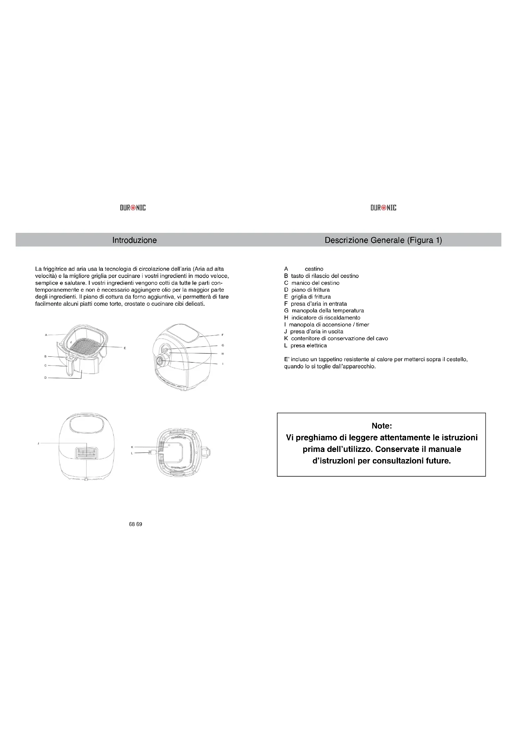 reparación, en virtud de la garantía. Este producto está equipado con enchufe Europeo y un fusible importado por Shine-Mart Ltd, RM38SB Información sobre la eliminación de residuos para los consumidores de equipos eléctricos/electrónico. Esta marca en un producto y/o documentos adjuntos indica que cuando se va a desechar, se debe tratar como residuos eléctricos/electrónico (WEEE). Cualquier producto marcado WEEE no debe ser mezclado con la basura doméstica, sino separado para el tratamiento, recuperación y reciclaje de los materiales utilizados. Para el tratamiento adecuado, recuperación y reciclaje; por favor, tome todos los productos WEEE y llévelo a su sitio de desechos Local autoridad cívica, donde será aceptado de forma gratuita Si los clientes disponen de residuos eléctricos/electrónico correctamente, ayudaran a ahorrar valiosos recursos y prevenir los potenciales efectos neg- ativos sobre la salud humana y el medio ambiente, de materiales peligrosos que pueden contener los residuos.66 67 Manuale D’istruzioni In Italiano68 69 Introduzione La friggitrice ad aria usa la tecnologia di circolazione dell’aria (Aria ad alta velocità) e la migliore griglia per cucinare i vostri ingredienti in modo veloce, semplice e salutare. I vostri ingredienti vengono cotti da tutte le parti con- temporanemente e non è necessario aggiungere olio per la maggior parte degli ingredienti. Il piano di cottura da forno aggiuntiva, vi permetterà di fare facilmente alcuni piatti come torte, crostate o cucinare cibi delicati. D e s c r i z i o n e G e n e r a l e ( F i g u r a 1 ) A cestino B tasto di rilascio del cestino C manico del cestino D piano di frittura E griglia di frittura F presa d’aria in entrata G manopola della temperatura H indicatore di riscaldamento I manopola di accensione / timer J presa d’aria in uscita K contenitore di conservazione del cavo L presa elettrica E’ incluso un tappetino resistente al calore per metterci sopra il cestello, quando lo si toglie dall’apparecchio. Note: Vi preghiamo di leggere attentamente le istruzioni prima dell’utilizzo. Conservate il manuale d’istruzioni per consultazioni future.70 71 -Mai immergere in acqua o pulire sotto il rubinetto, poichè l’apparecchio contiene componenti elettronici e inammabili. -Non fare entrare acqua o liquidi all’interno dell’apparecchio, onde evitare corto circuiti. -Mettere gli ingredienti sempre nel cestino di frittura, onde evitare contatti con gli elementi inammabili. -Mai coprire la presa d’aria in entrata e uscita mentre l’apparecchio è in funzione. -Non riempire d’olio il cestello, poichè potrebbe causare un pericolo di fuoco. -Non toccare l’interno mentre l’apparecchio è in funzione. -Prima di collegare l’apparecchio, si prega di vericare il voltaggio della friggitrice in modo che combaci con il voltaggio dell’alimentazione elettrica del Vostro paese. -Non utilizzare l’apparecchio se il cavo elettrico è danneggiato. Se il cavo elettrico è danneggiato, dovete sostituirlo da un elettricista qualicato, in modo da evitare un pericolo di fuoco. -Questo apparecchio può essere utilizzato dai bambini dagli 8 anni in su e da persone con capacità siche, sensoriali e mentali ridotte, o con mancanza di esperienza e conoscenza, purchè siano supervisionati o guidati da una persona che assicuri la loro incolumità. I bambini devono essere supervisionati per assicurarsi che non giochino con l’apparecchio. -Tenere l’apparecchio e il cavo elettrico fuori dalla portata dei bambini mentre l’apparecchio è in funzione o si sta raffreddando. Tenere il cavo elettrico lontano dalle superci con alte temperature. -Non inserire la spina dell’apparecchio o utilizzare il pannello di controllo con le mani bagnate. Assicuratevi che la spina sia opportunamente inserita nella xxxxxxxxxxxxxx xxxxxxxxxxxxxx Pericoli Avvertenze xxxxxxxxxxxxxx Spegnimento Automatico Note presa della corrente. -Non provate a utlizzare l’applicazione mediante un timer esterno. -Non posizionare l’apparecchio vicino a materiali inammabili, come una tovaglia o una tenda. -Mai posizionare l’apparecchio contro il muro o altri apparecchi. Tenere una distanza di almeno 10cm di spazio libero dietro e nei lati e 10cm di spazio libero sopra l’apparecchio. Mai posizionare qualche oggetto sopra l’apparecchio. -Mai utilizzare questo apparecchio per qualsiasi altro proposito diverso da quelli descritti nel manuale d’istruzioni. -Il vapore caldo sarà rilasciato dalla presa dell’aria in uscita durante la frittura. Tieni le mani e il viso a distanza di sicurezza. Fare inoltre attenzione al vapore caldo e alle temperature alte quando si rimuove il cestello. - La superce potrebbe diventare molto calda durante l’utilizzo. (gura 2) -Spegni immediatamente o togli la spina dall’apparecchio se vedi fumo scuro venire fuori dall’apparecchio. Attendi che la fuoriuscita di fumo nisca prima di rimuovere il cestello. -Posizione l’apparecchio in una superce orizzontale o stabile. -Restituisci l’apparecchio alla fabbrica o a un centro di riparazioni autorizzato. Non riparare l’apparecchio da solo; altrimenti la garanzia diventerà invalida. -Assicurati di togliere la spina dall’apparecchio dopo l’utilizzo. Fare raffreddare per circa 30 minuti prima di pulire. Assicurati che gli ingredienti si presentino di un colore dorato, non scuro. Questo apparecchio è dotato di un timer. Quando il timer raggiunge lo 0, l’apparecchio suonerà e si spegnerà automaticamente. Per spegnerla manualmente, portate il timer a 0.72 73 Campi Elettromagnetici P r i m a d e l l ’ u t i l i z z o C o m e u t i l i z z a r e Questo prodotto è conforme agli standard relativi al campo magnetico. Se usato correttamente seguendo il manuale d’istruzioni, il prodotto è sicuro. 1 Mettere a distanza tutto il materiale nell’imballaggio. 2 Rimuovere gli adesivi dall’apparecchio. 3 Usare acqua calda, lavapiatti e una spugna non abra