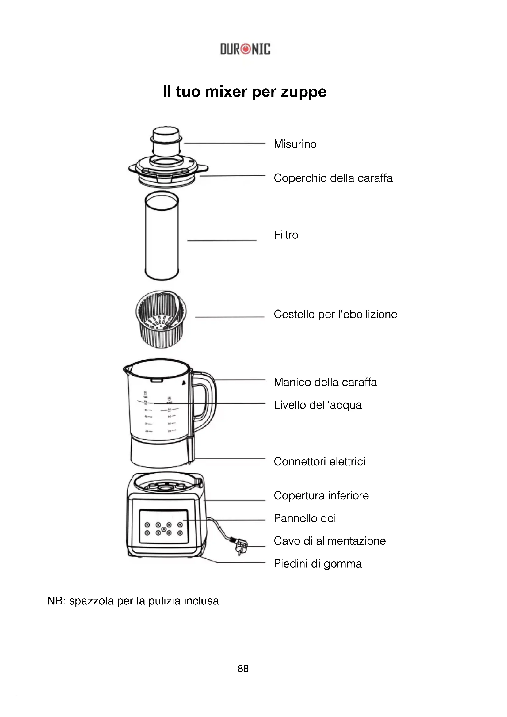 condizioni Per parti di ricambio si prega di consultare il sito www.duronic.com Corretto smaltimento del prodotto. Qusto prodotto è inclusivo di spina certicata BS importata da Shine-Mart Ltd, RM3 8SB Questo segno su un prodotto o su documenti indica che quando deve essere smaltito, deve essere trattato come i rifiuti elettrici ed elettronici (WEEE) Tutti I prodotti marcati WEEE non devono essere buttati nei rifiuti domenistici generici, ma separati per il trattamento, il recupero e il riciclaggio dei materiali utilizzati. Per un corretto trattamento, recupero e riciclaggio; si prega di portare tutti I prodotti marcati WEEE al Vostro centro smaltimenti rifiuti autorizzato, dove saranno accettati gratuitamente. Se i consumatori sono propensi allo smaltimento corretto di rifiuti elettrici ed elettronici, aiuteranno a salvare risorse importanti e a prevenire i potenziali effetti negativi sulla salute umana e sull’ambiente di tutti i materiali pericolosi che i rifiuti possono contenere. Garanzia106107 Instrukcja obsługi. Polski108 Elementy produktu Uwaga: Zestaw zawiera gąbkę do mycia urządzenia. Miarka Pokrywka Filtr Kosz do gotowania na parze Uchwyt kielicha Złącze Jednostka sterująca Panel kontrolny Wtyczka przewodu Antypoślizgowe nóżki Miarka poziomu wody109 Charakterystyka 2 automatyczne prog. do zup Funkcja podgrzewania Funkcja smoothie Funkcja Blendera Podświetlane przyciski Nóżki antypoślizgowe