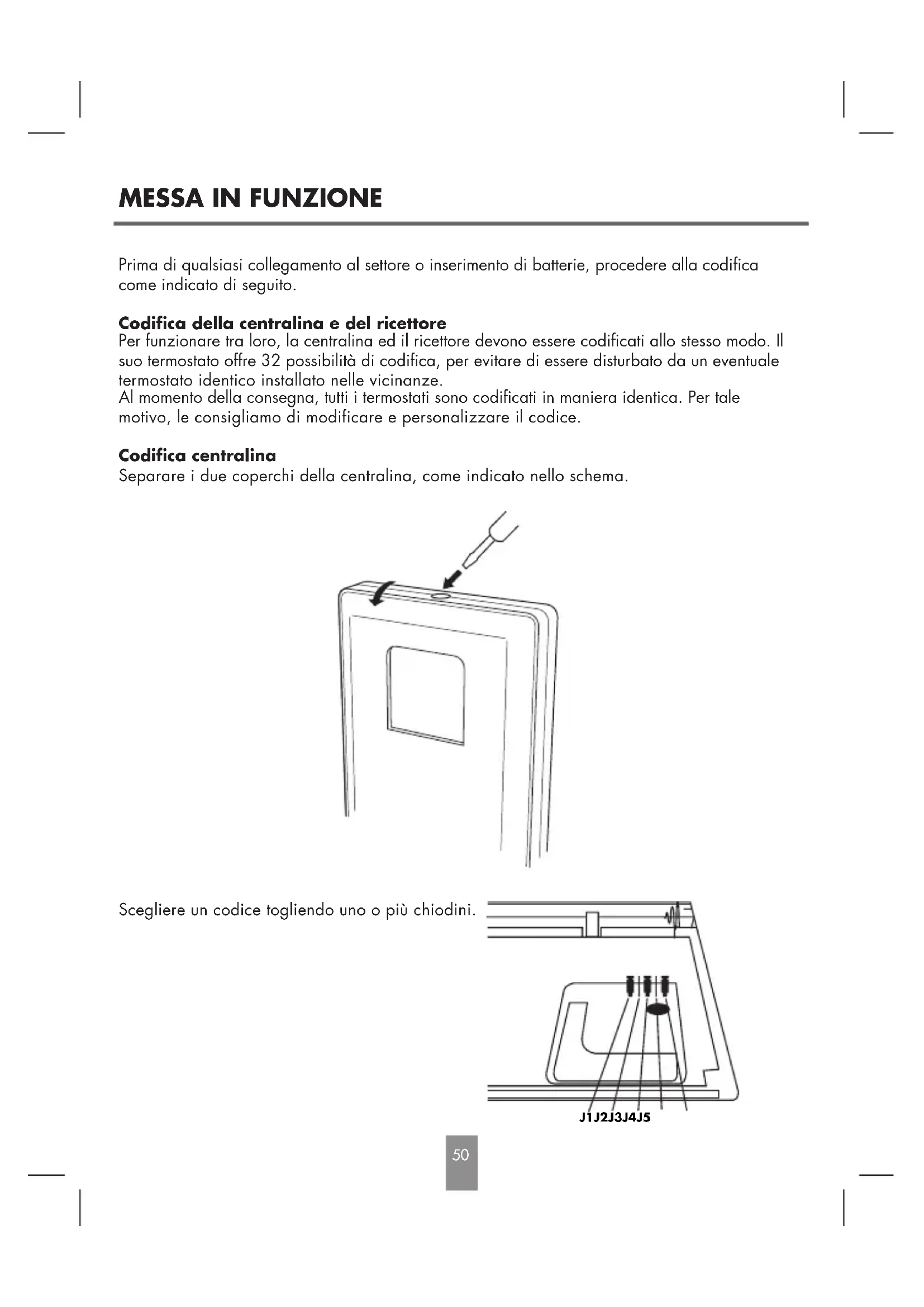 Interrupteur marche/arrêt Voyant marche/arrêt Voyant de fonctionnement CONTENITORE COPERCHIOVISTA FRONTALE RETRO Indicazione del funzionamento del riscaldamento o del condizionamento d’aria Bornier COM NC NO Bornier L Bornier N Interruttore acceso/spento Spia acceso/ spento Spia di funzionamento Morsettiera Morsettiera Morsettiera Prima di qualsiasi collegamento al settore o inserimento di batterie, procedere alla codifica come indicato di seguito. Codifica della centralina e del ricettore Per funzionare tra loro, la centralina ed il ricettore devono essere codificati allo stesso modo. Il suo termostato offre 32 possibilità di codifica, per evitare di essere disturbato da un eventuale termostato identico installato nelle vicinanze. Al momento della consegna, tutti i termostati sono codificati in maniera identica. Per tale motivo, le consigliamo di modificare e personalizzare il codice. Codifica centralina Separare i due coperchi della centralina, come indicato nello schema. Scegliere un codice togliendo uno o più chiodini.