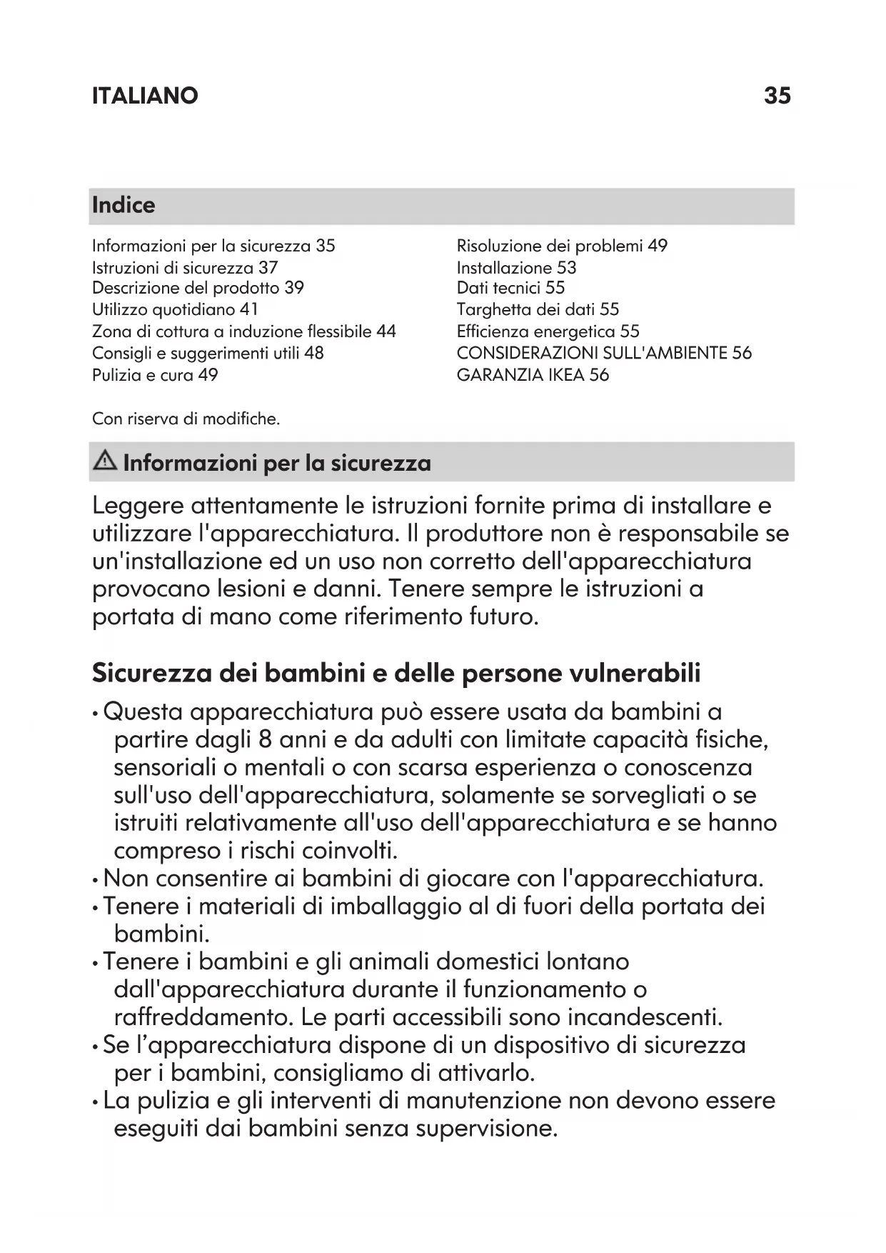 - Utilizzare il calore residuo per mantenere caldi i cibi o fonderli. CONSIDERAZIONI SULL'AMBIENTE Riciclare i materiali con il simbolo . Buttare l'imballaggio negli appositi contenitori per il riciclaggio. Aiutare a proteggere l’ambiente e la salute umana e a riciclare rifiuti derivanti da apparecchiature elettriche ed elettroniche. Non smaltire le apparecchiature che riportano il simbolo insieme ai normali rifiuti domestici. Portare il prodotto al punto di riciclaggio più vicino o contattare il comune di residenza. GARANZIA IKEA Validità della garanzia La presente garanzia è valida per cinque (5) anni a partire dalla data di acquisto originale del Vostro elettrodomestico presso un punto vendita IKEA. Per gli elettrodomestici LAGAN, la garanzia è di due (2) anni soltanto. Lo scontrino originale è indispensabile come ricevuta d'acquisto. Una riparazione effettuata nell'ambito della garanzia non estende il periodo di garanzia per l'elettrodomestico o per i nuovi pezzi di ricambio. Elettrodomestici non coperti dalla garanzia IKEA di cinque (5) anni La garanzia IKEA di cinque anni non è valida per gli elettrodomestici con il nome LAGAN e tutti gli elettrodomestici acquistati presso un punto vendita IKEA prima dell'1 agosto 2007. ITALIANO 56Chi fornisce il servizio ai clienti? L'assistenza ai clienti sarà garantita dal fornitore del servizio nominato da IKEA attraverso la propria organizzazione o la propria rete di partner di assistenza autorizzati. Cosa copre la garanzia? La garanzia copre gli eventuali difetti legati ai materiali e o alla costruzione dell'elettrodomestico ed è valida a partire dalla data di acquisto dell'elettrodomestico presso un punto vendita IKEA. La garanzia è valida solo su elettrodomestici destinati all'impiego domestico. Le eccezioni sono descritte alla voce "Cosa non copre la garanzia". Nel periodo di validità della garanzia, il fornitore del servizio nominato da IKEA sosterrà i costi per la riparazione, i pezzi di ricambio, la manodopera e le trasferte del personale di manutenzione, ammesso che il prodotto possa essere riparato senza costi troppo elevati e che il difetto legato ai materiali o alla costruzione rientri nella copertura dell garanzia. Queste condizioni sono conformi alle direttive EU (N. 99/44/CE) e alle norme e disposizioni locali applicabili. Le parti sostituite diventeranno di proprietà di IKEA. Come interverrà IKEA per risolvere il problema? Il fornitore del servizio nominato da IKEA esaminerà il prodotto e deciderà a propria esclusiva discrezione se lo stesso rientra nella copertura della garanzia. In caso affermativo, il fornitore del servizio nominato da IKEA o un suo partner di assistenza autorizzato provvederà a propria esclusiva discrezione a riparare il prodotto difettoso o a sostituirlo con un prodotto uguale o equivalente. Cosa non copre la garanzia